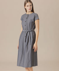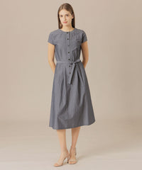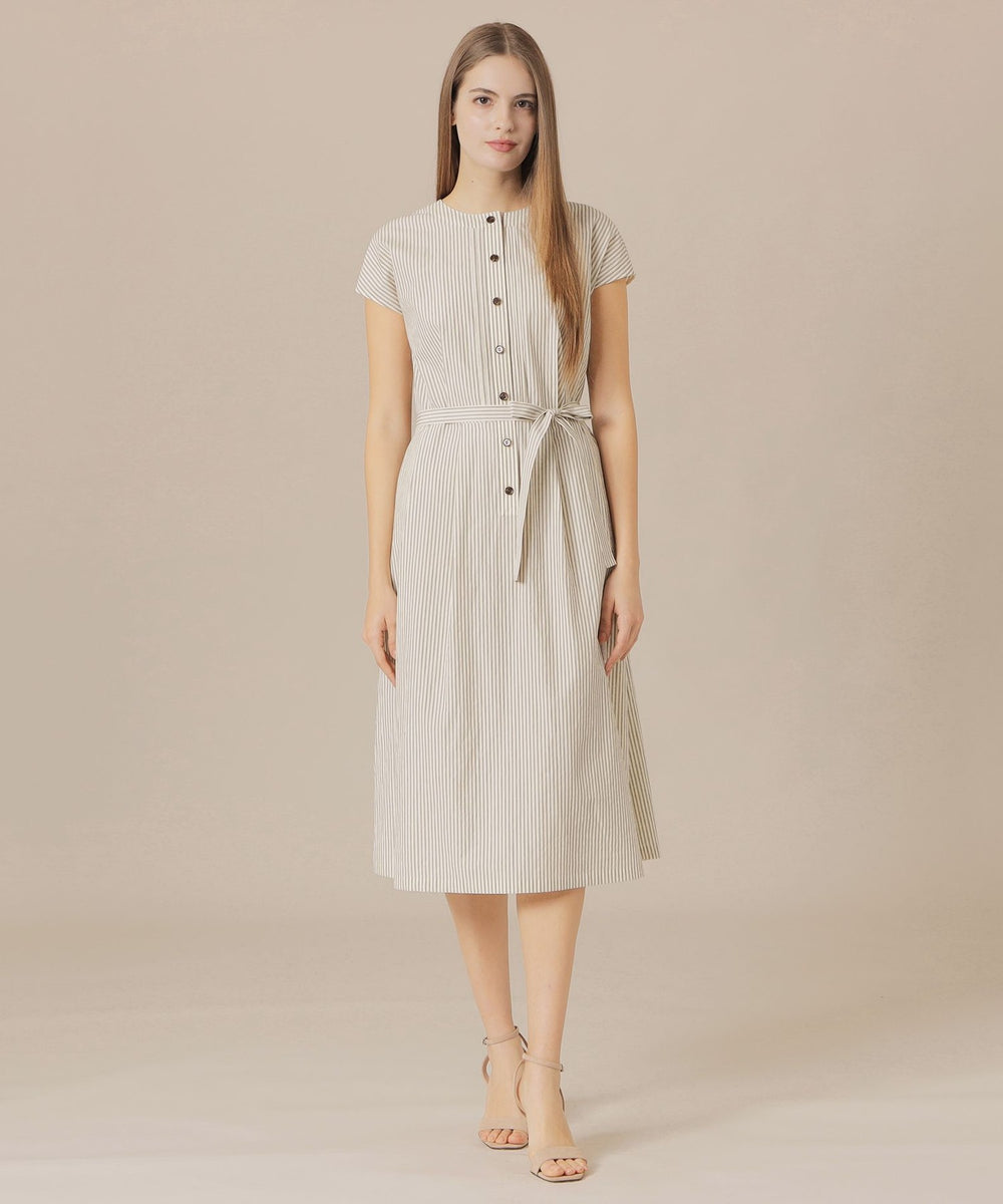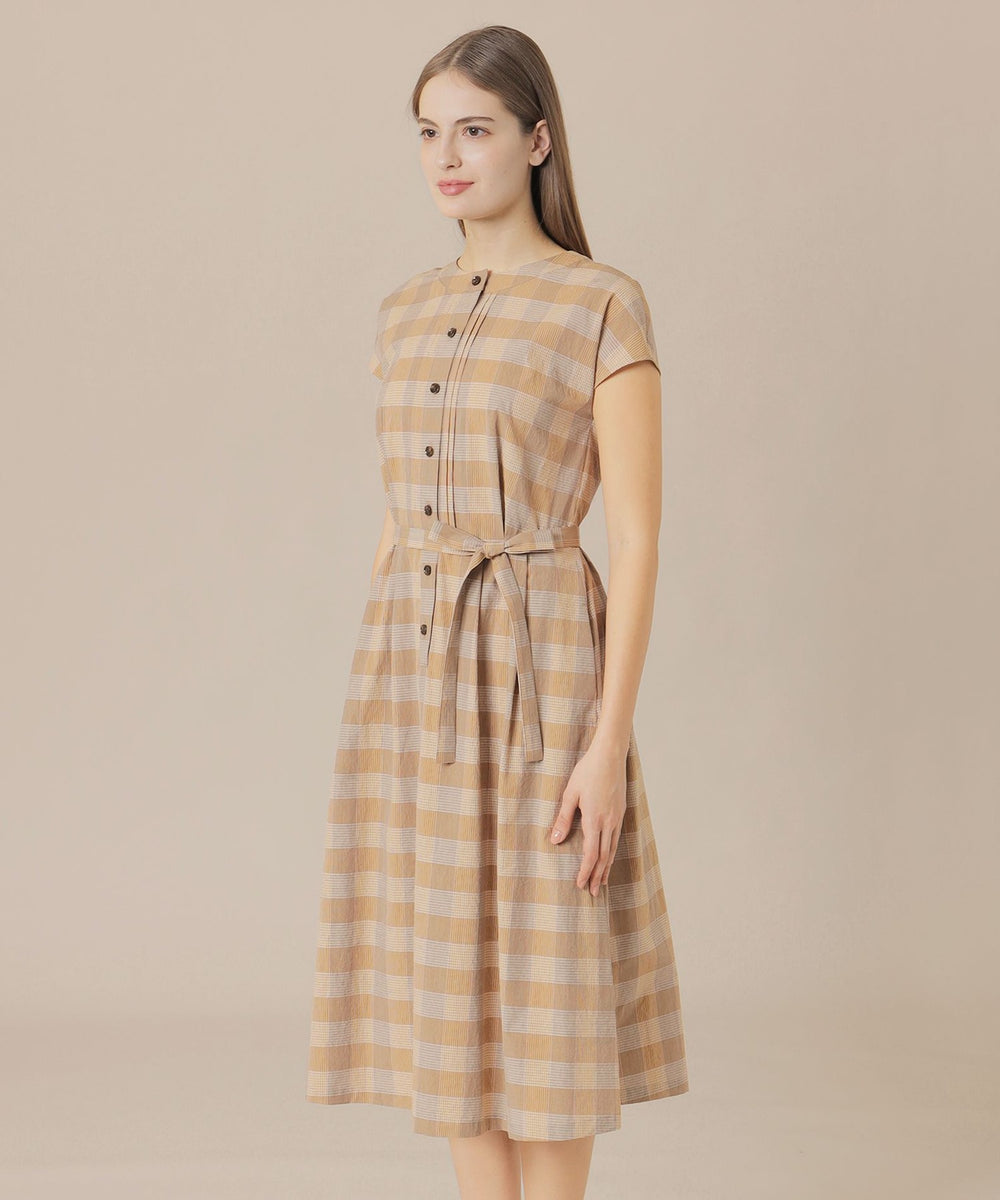 ベーシックなデザインにフロントのタックや釦をアクセントにし、トラッドな雰囲気に仕上げたワンピースです。身体のラインを拾い過ぎないシルエットで、オンオフ問わず幅広いシーンに活躍する上品な表情のアイテムです。アンダースカート付きです。