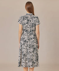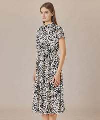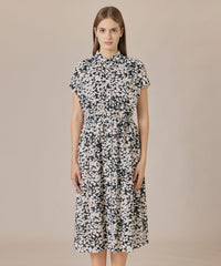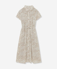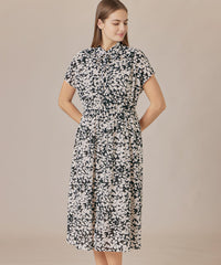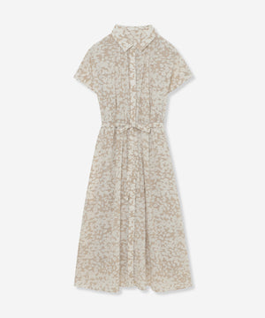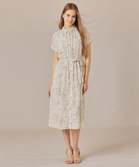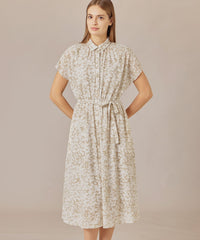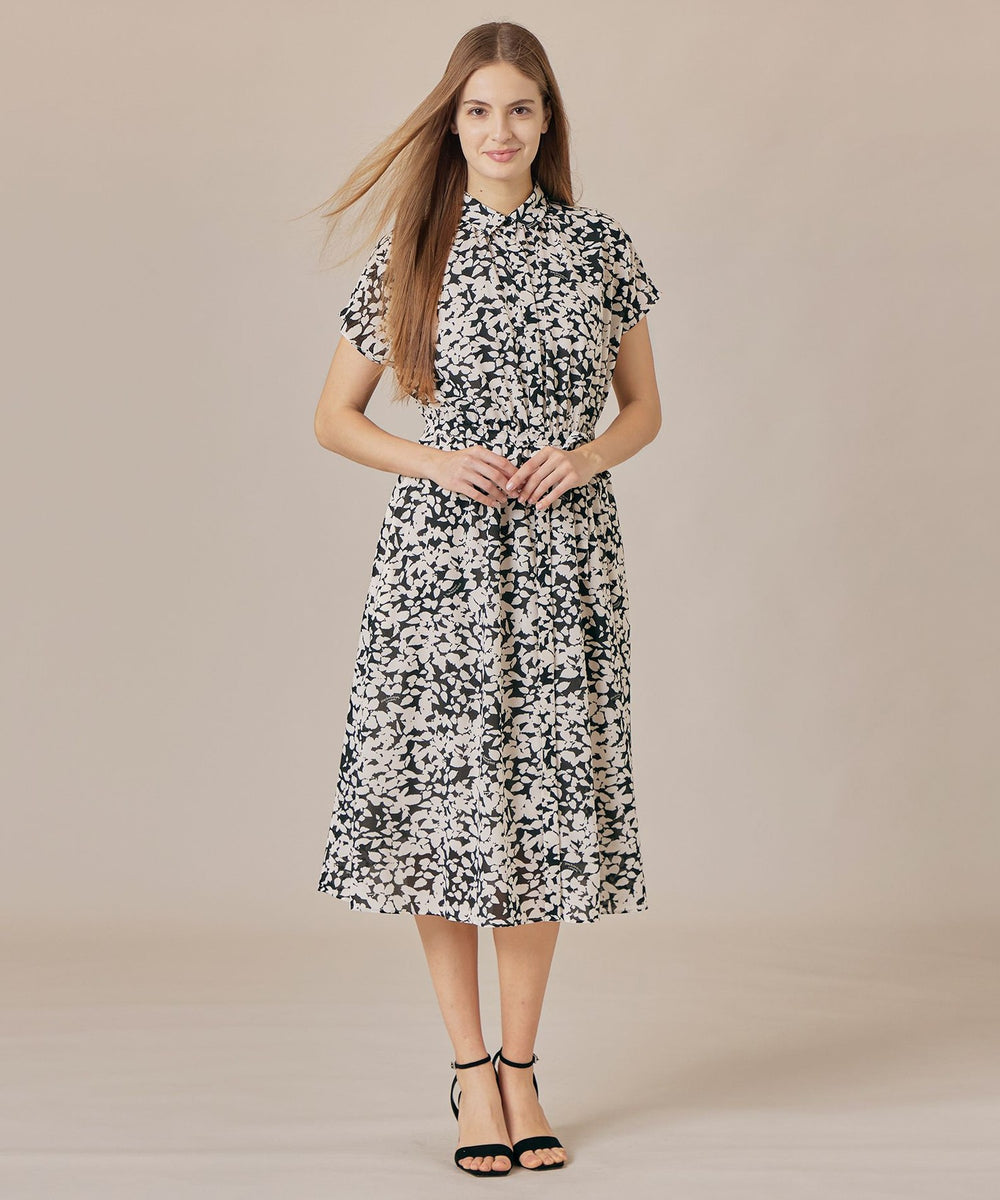 シャツカラーできちんと感がありながら、ネックのギャザーとフレンチリーブでほど良い抜け感のあるバランスに仕上げたワンピースです。付属のリボンでウエストを絞り上品な着こなしもおすすめです。裏地なし、アンダードレス付きです。同素材のブラウス(G7M65587)、スカート(G7S66587)もご用意しております。