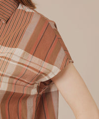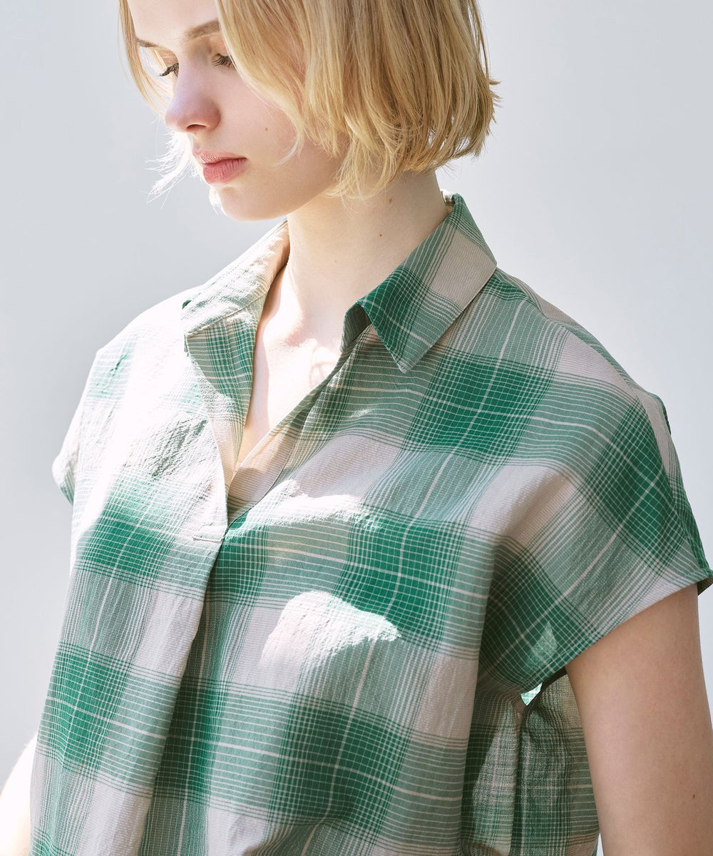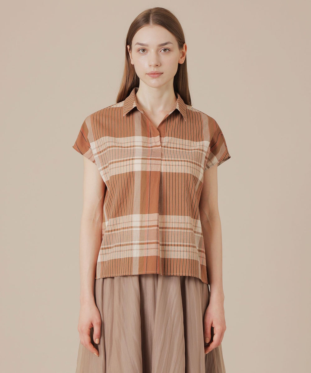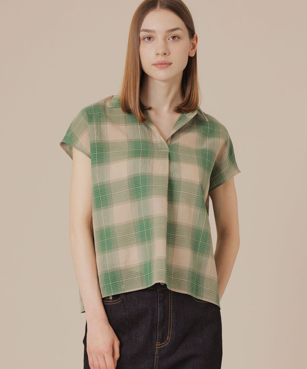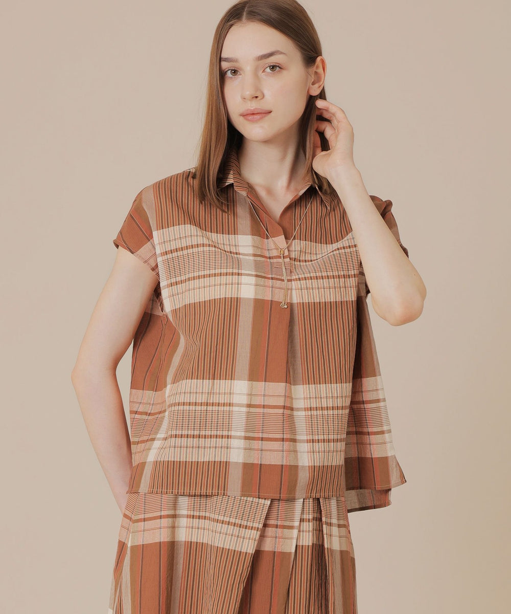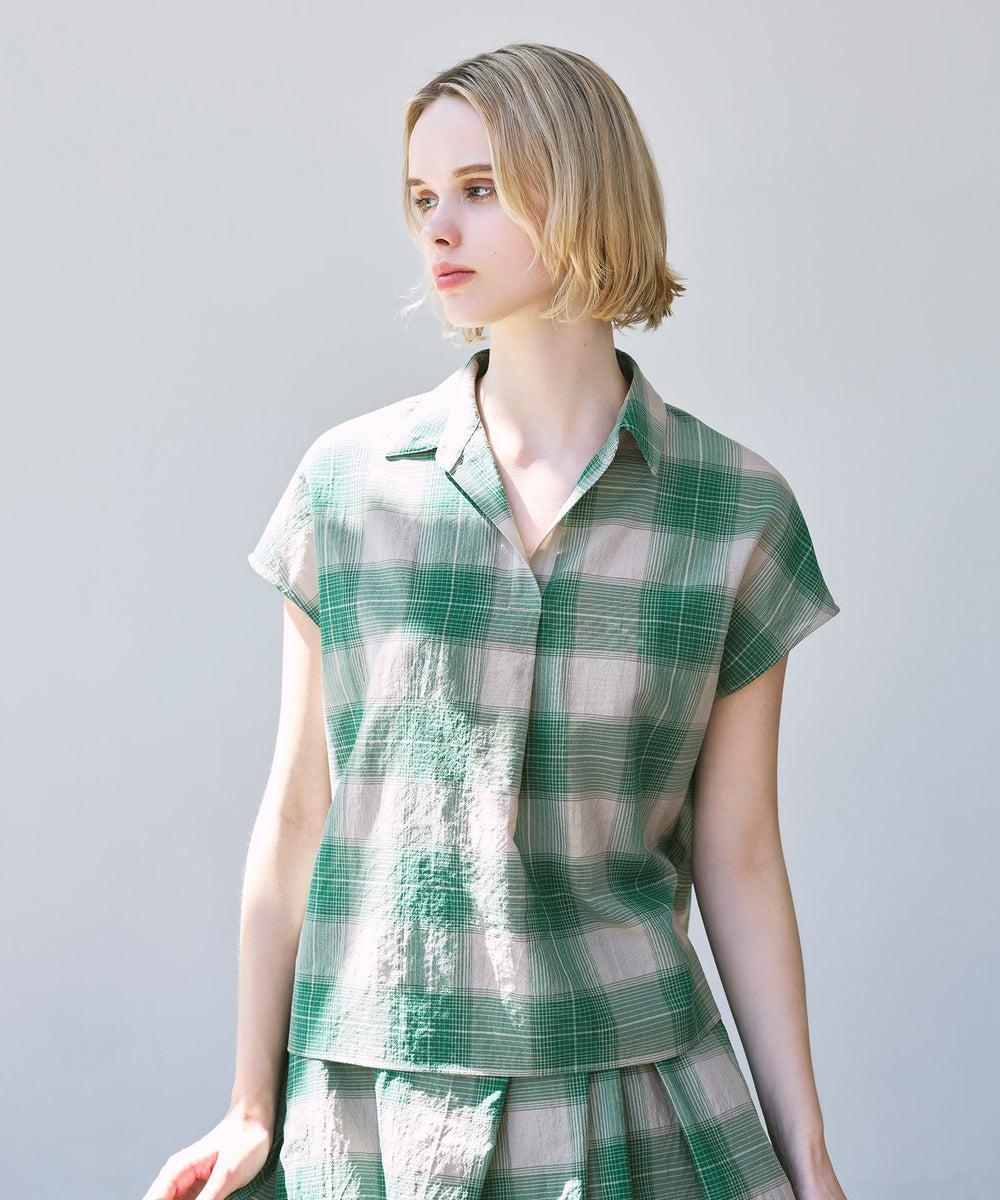 短めのフレンチスリーブがほど良く二の腕をカバーしながら腕を華奢に見せるバランスに仕上げたスキッパーシャツです。爽やかなチェック柄で着こなしに華やかさをプラスするアイテムです。同素材のスカート(品番:G7S02601)もご用意しております。