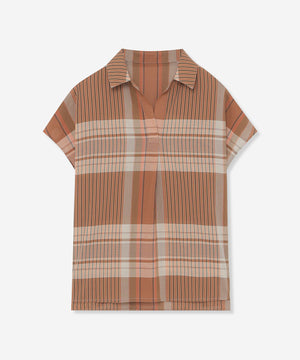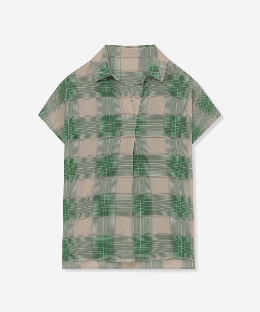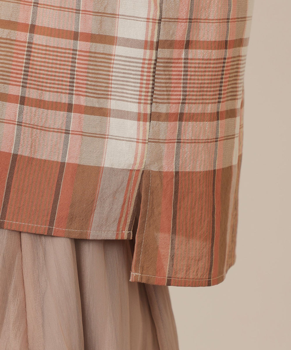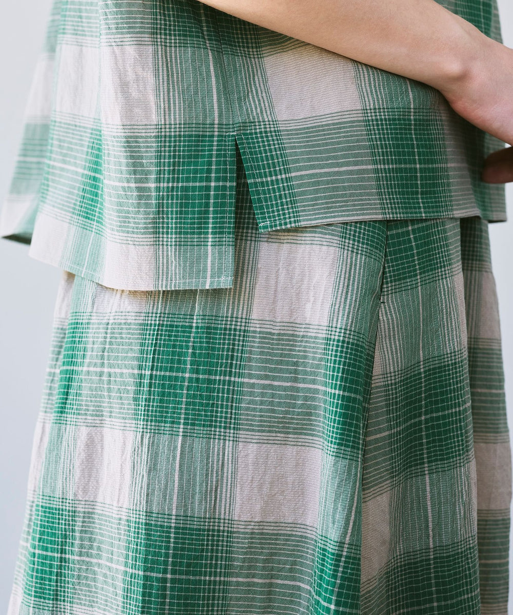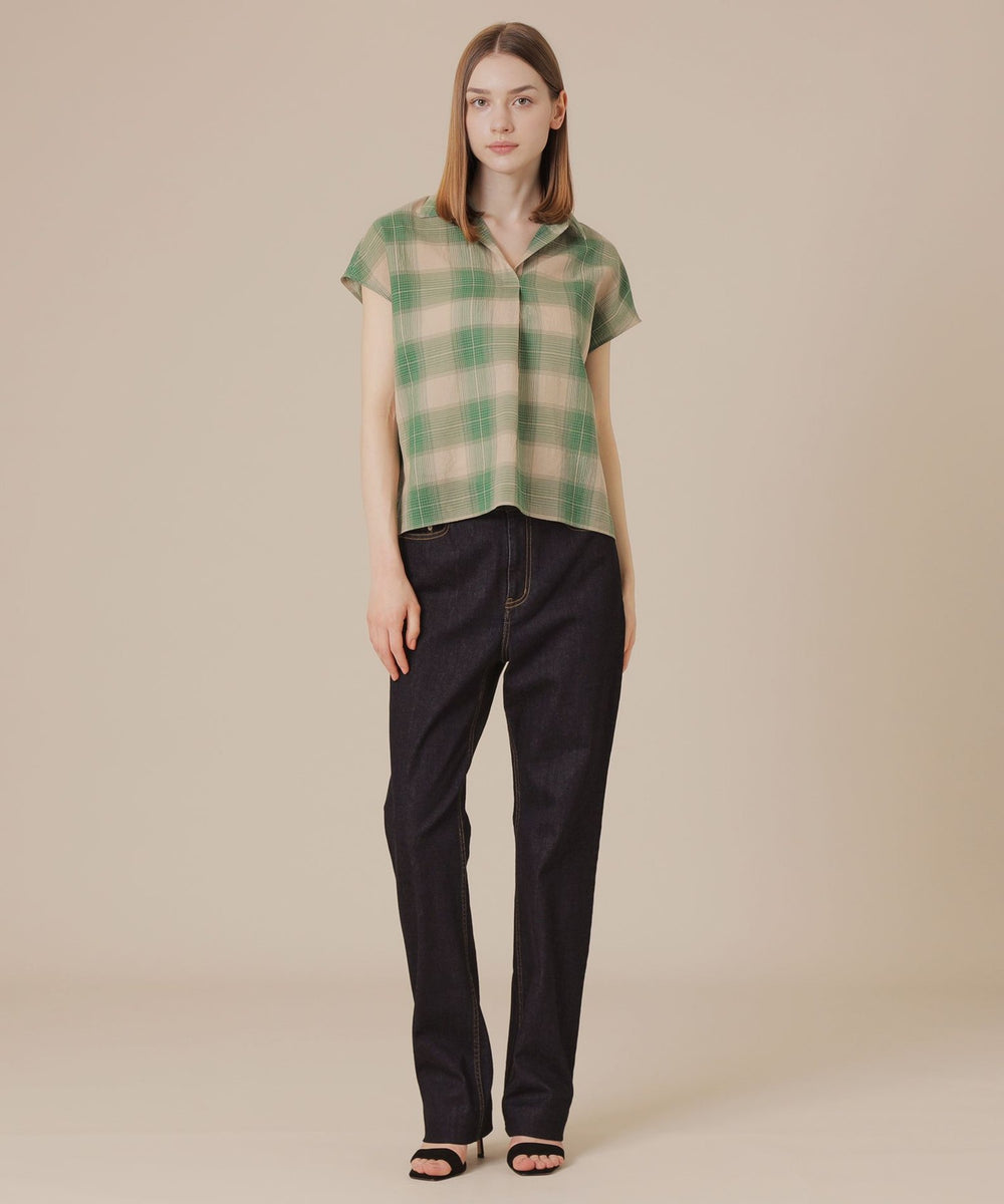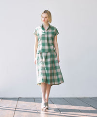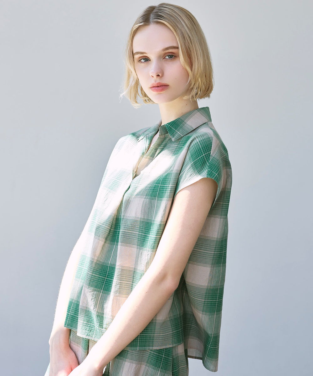 短めのフレンチスリーブがほど良く二の腕をカバーしながら腕を華奢に見せるバランスに仕上げたスキッパーシャツです。爽やかなチェック柄で着こなしに華やかさをプラスするアイテムです。同素材のスカート(品番:G7S02601)もご用意しております。