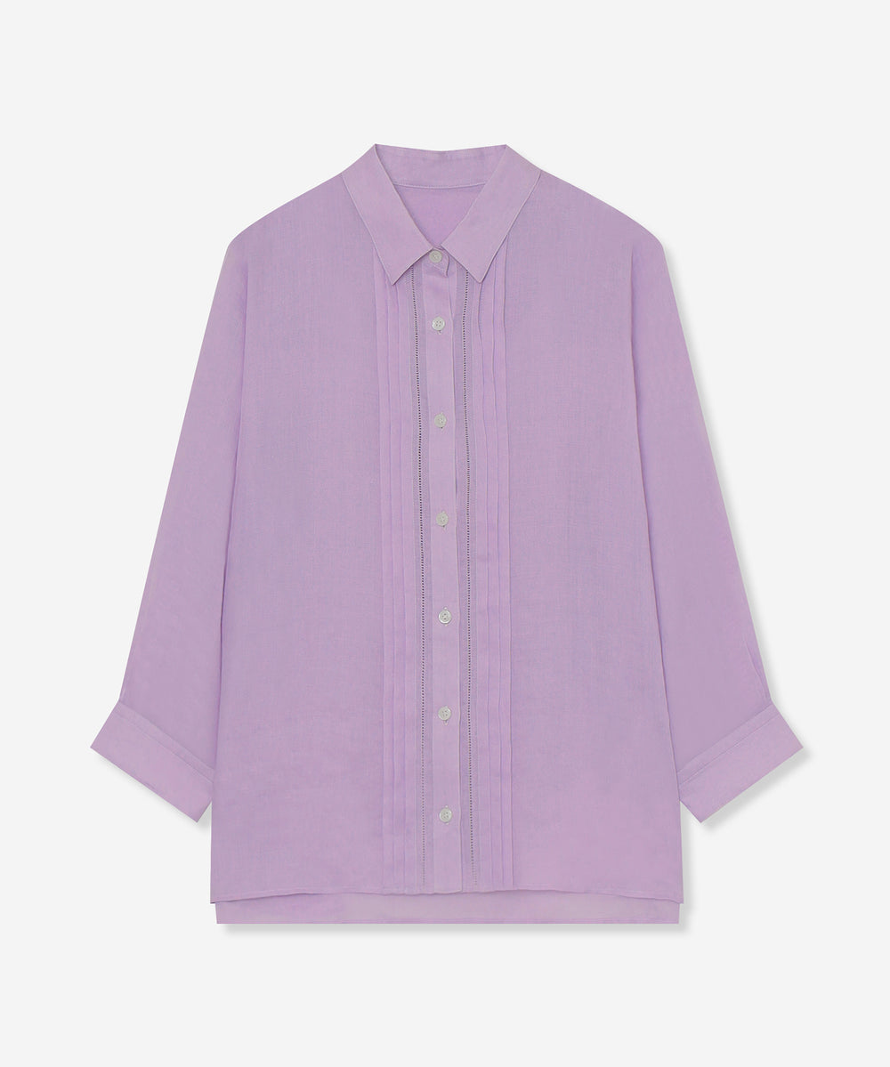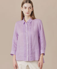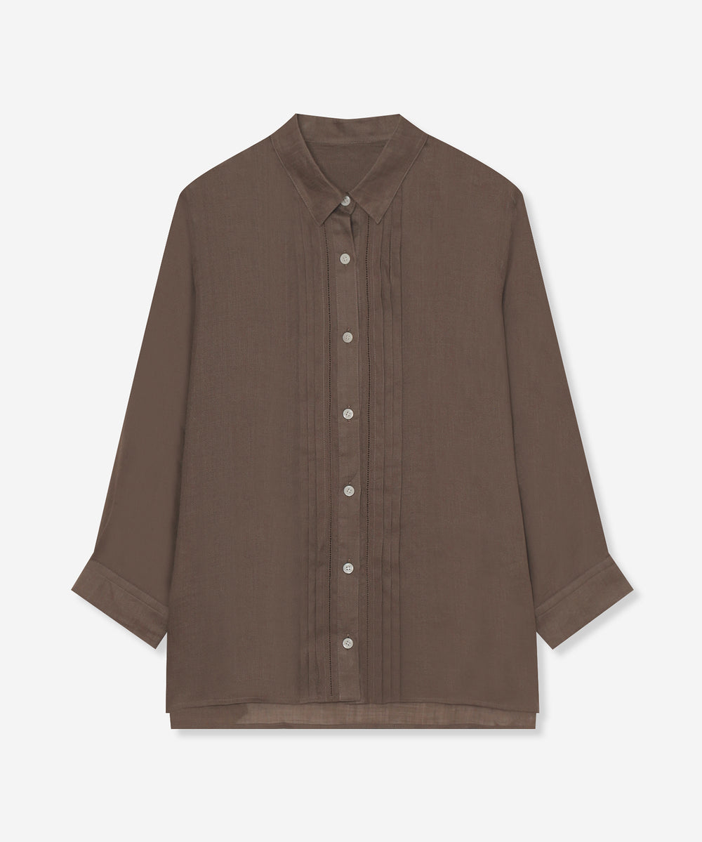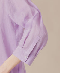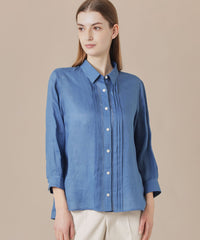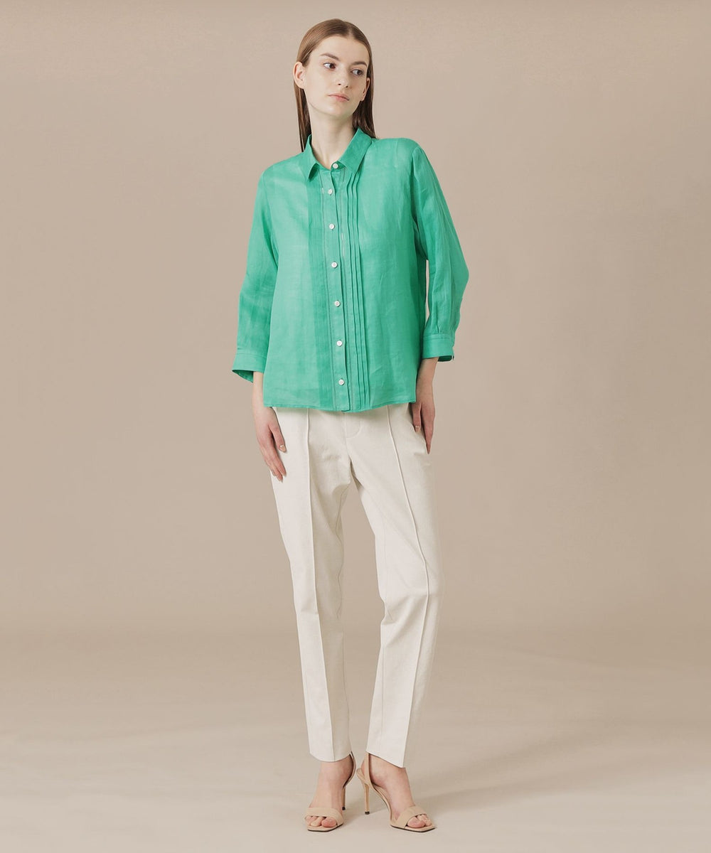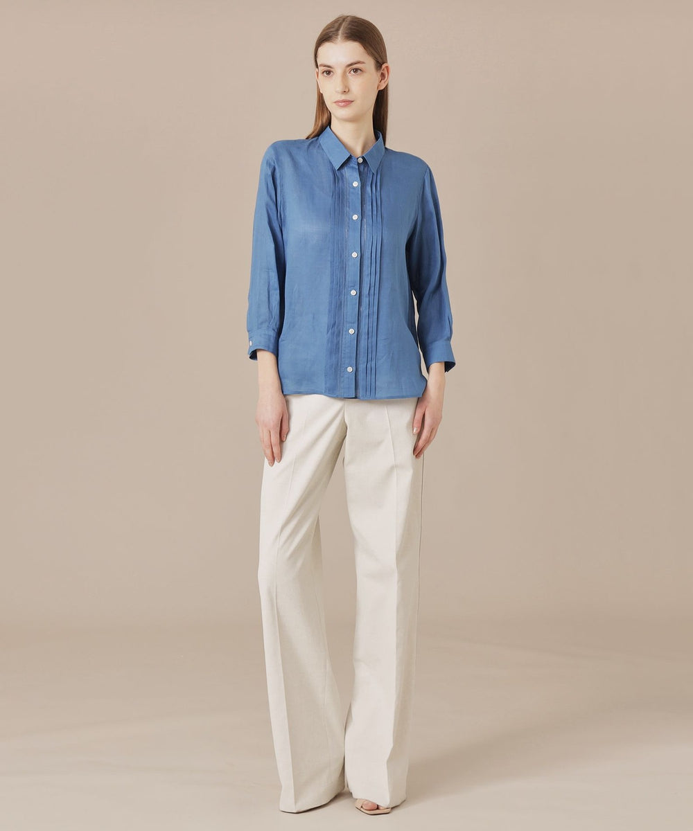 程よくゆとりのあるシルエットでリラックス感のあるラミーのブラウスです。フロントのピコ刺しゅうとタックのディテールを生かしジャケットのインナーとして、また前を開けて羽織としても活躍します。