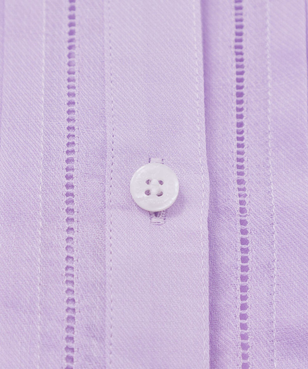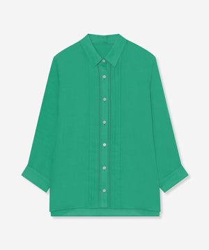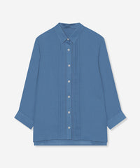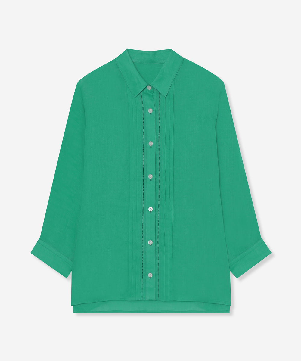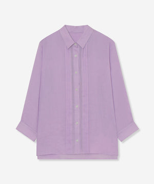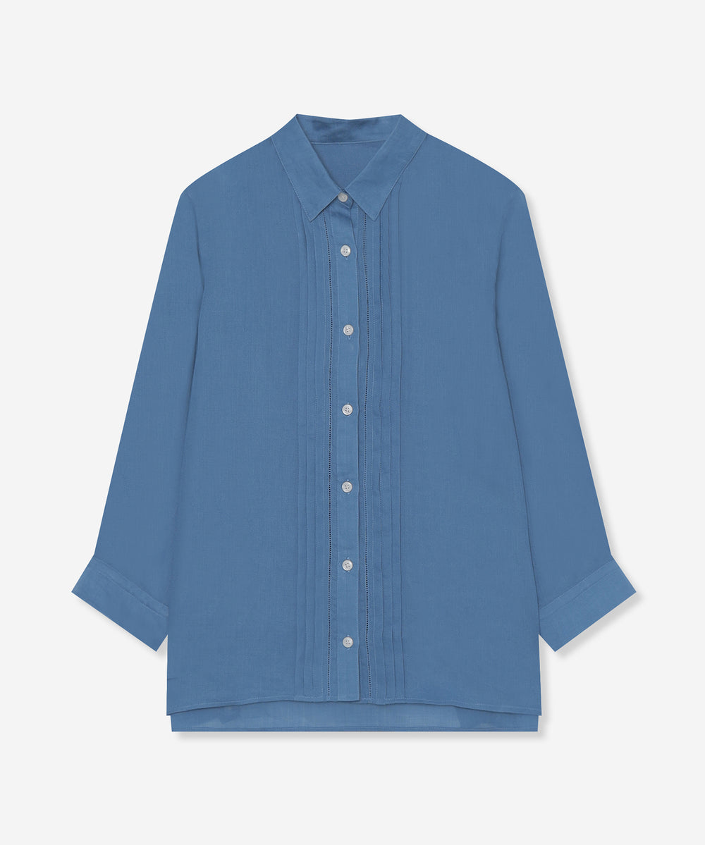 程よくゆとりのあるシルエットでリラックス感のあるラミーのブラウスです。フロントのピコ刺しゅうとタックのディテールを生かしジャケットのインナーとして、また前を開けて羽織としても活躍します。