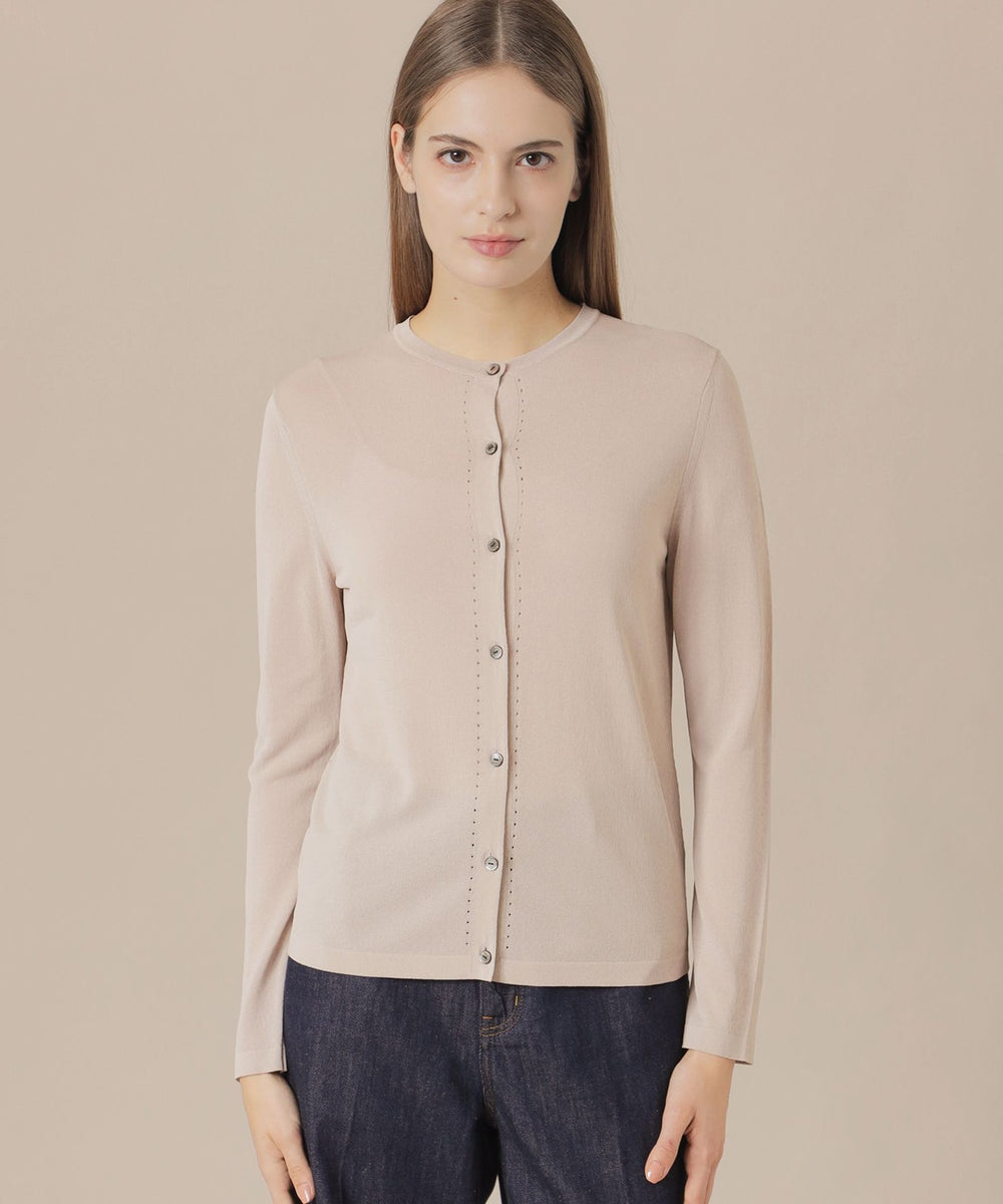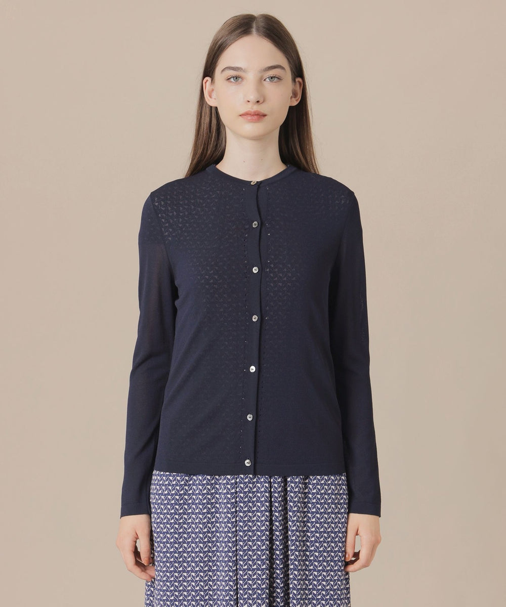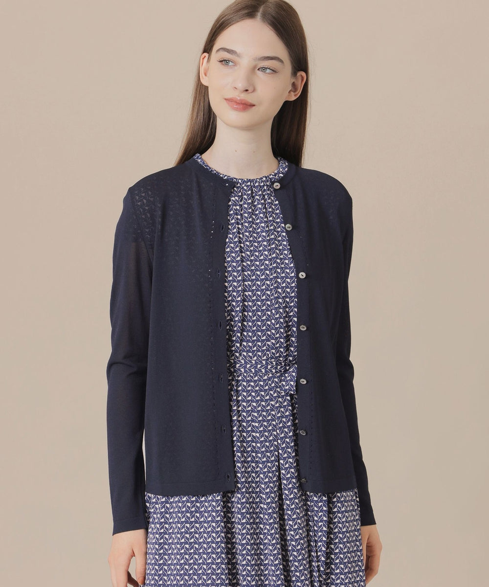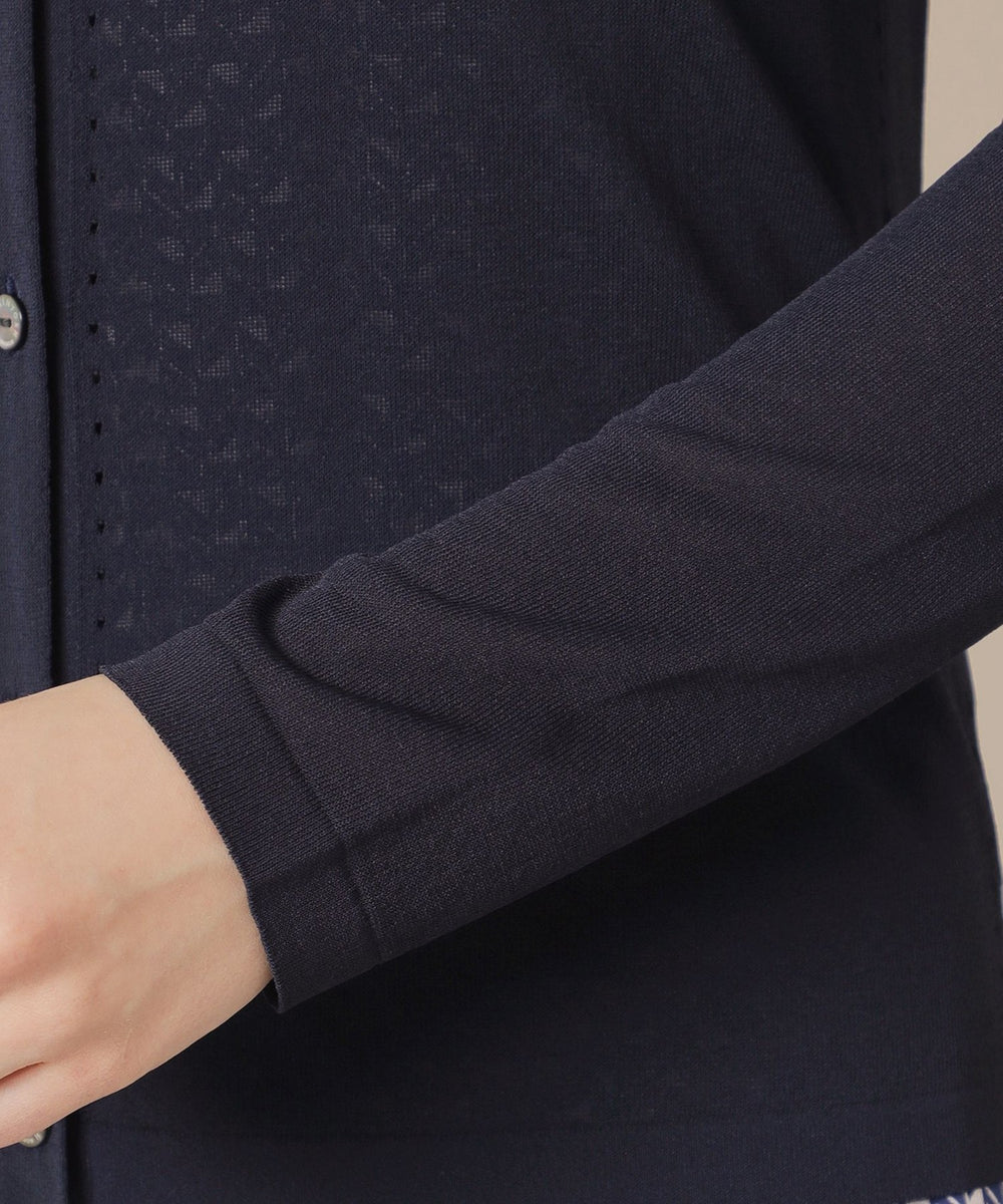繊細なアイレットを前立てとサイドラインに施したシャープな印象のカーディガンです。ノースリーブなどの羽織に涼しげな印象のアイテムは春先から晩夏までご着用いただけます。