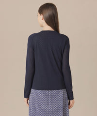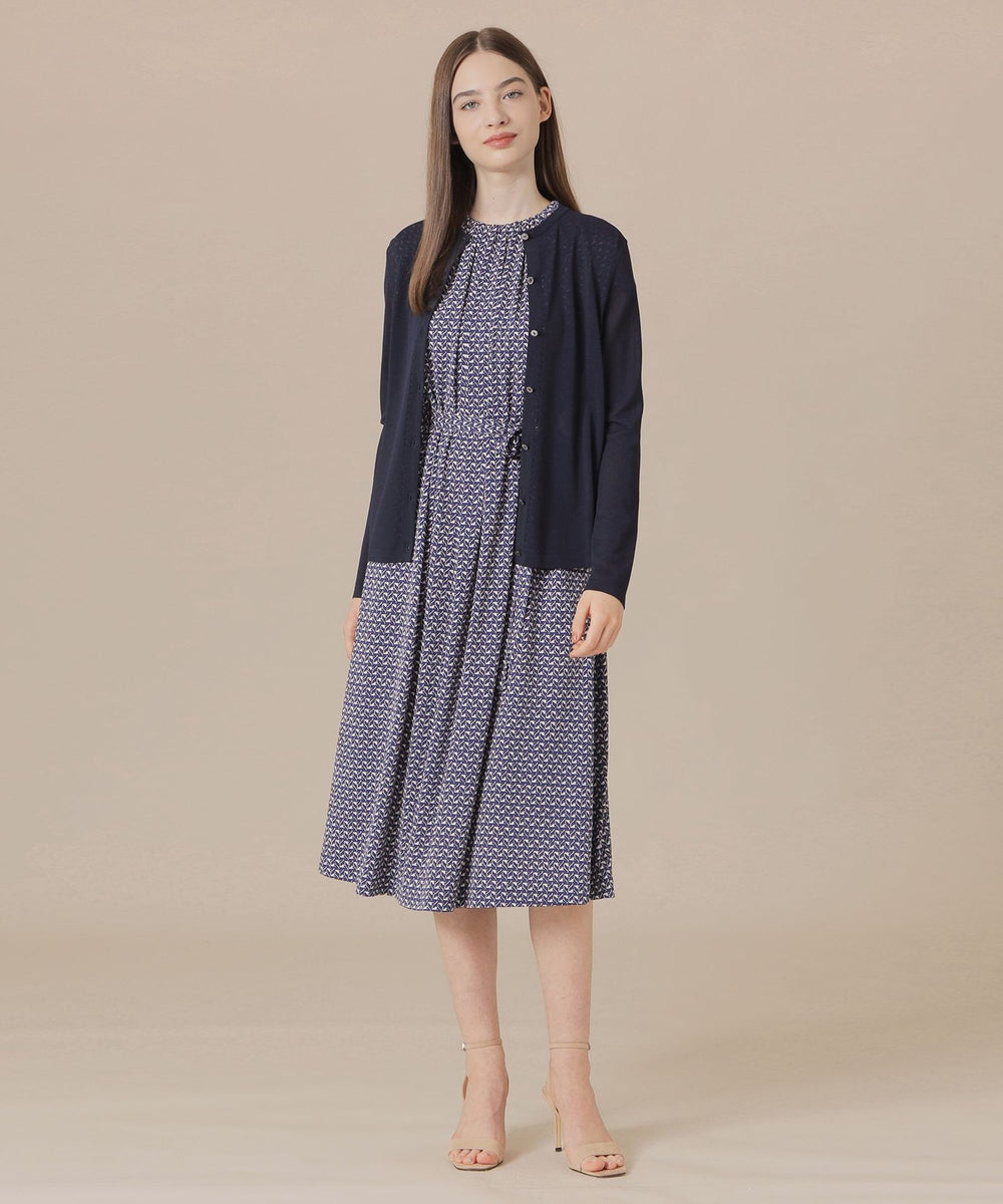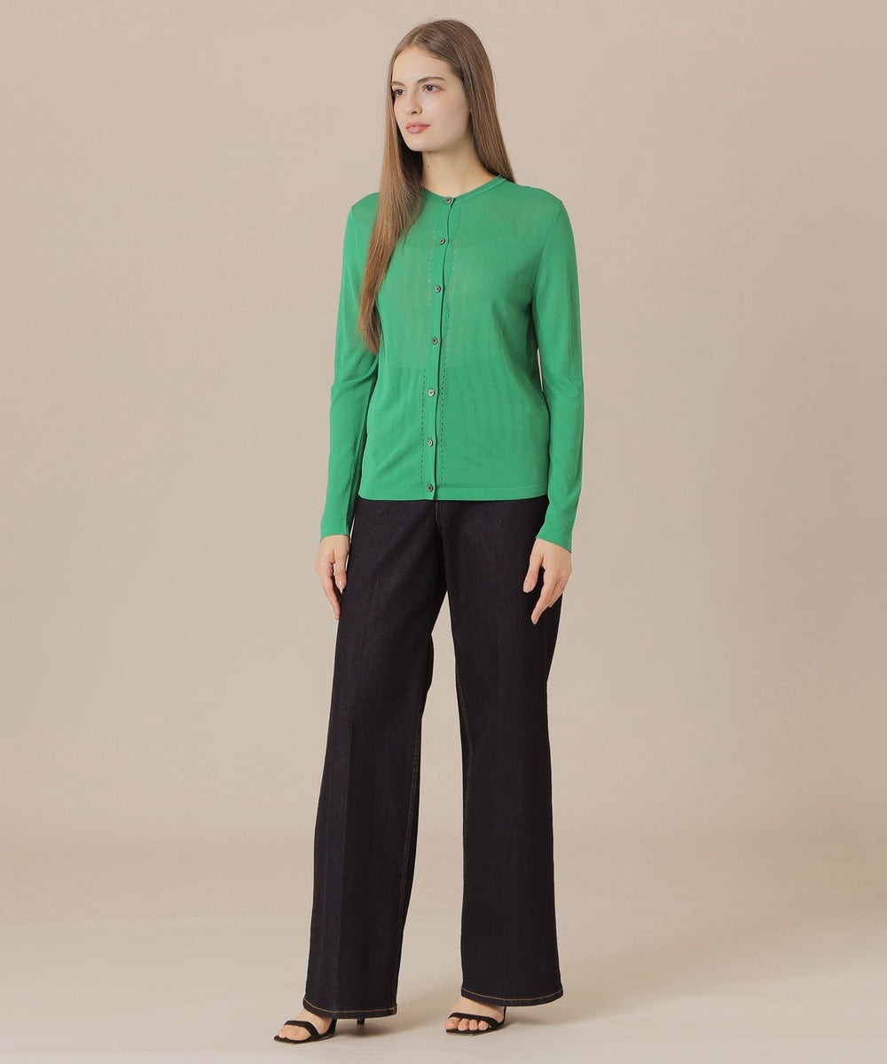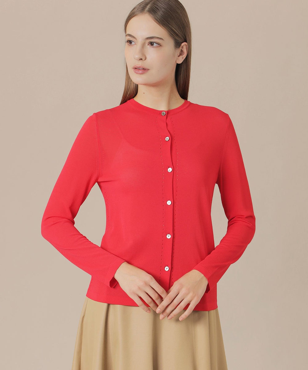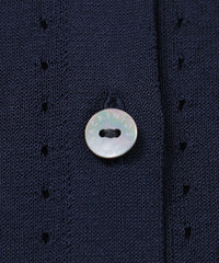 繊細なアイレットを前立てとサイドラインに施したシャープな印象のカーディガンです。ノースリーブなどの羽織に涼しげな印象のアイテムは春先から晩夏までご着用いただけます。