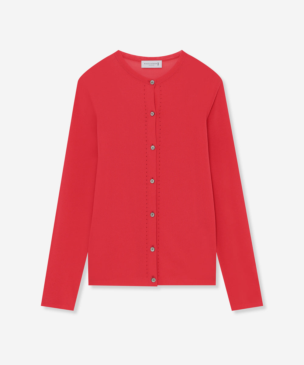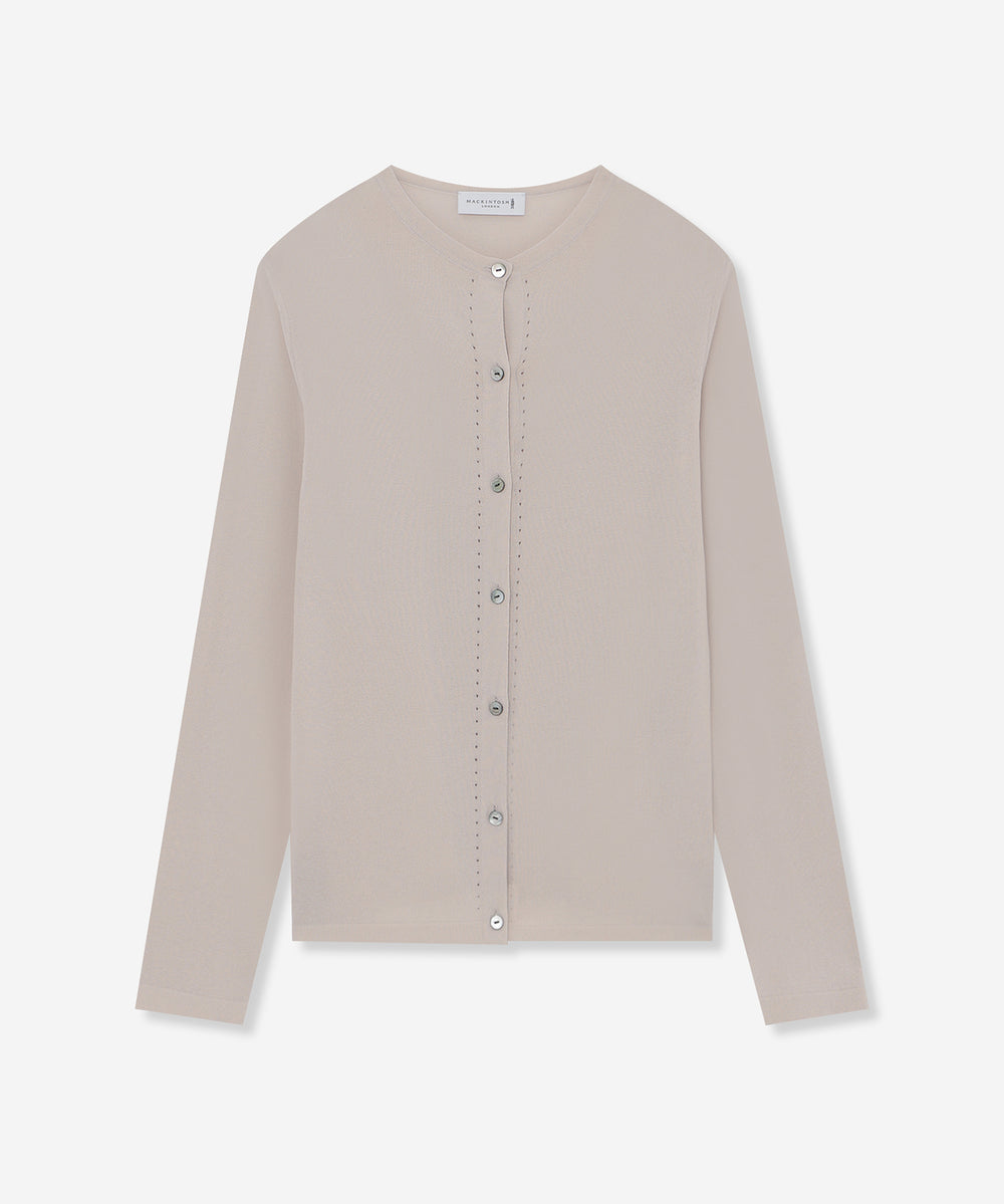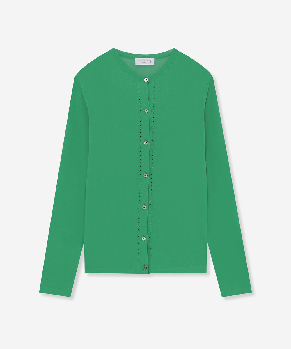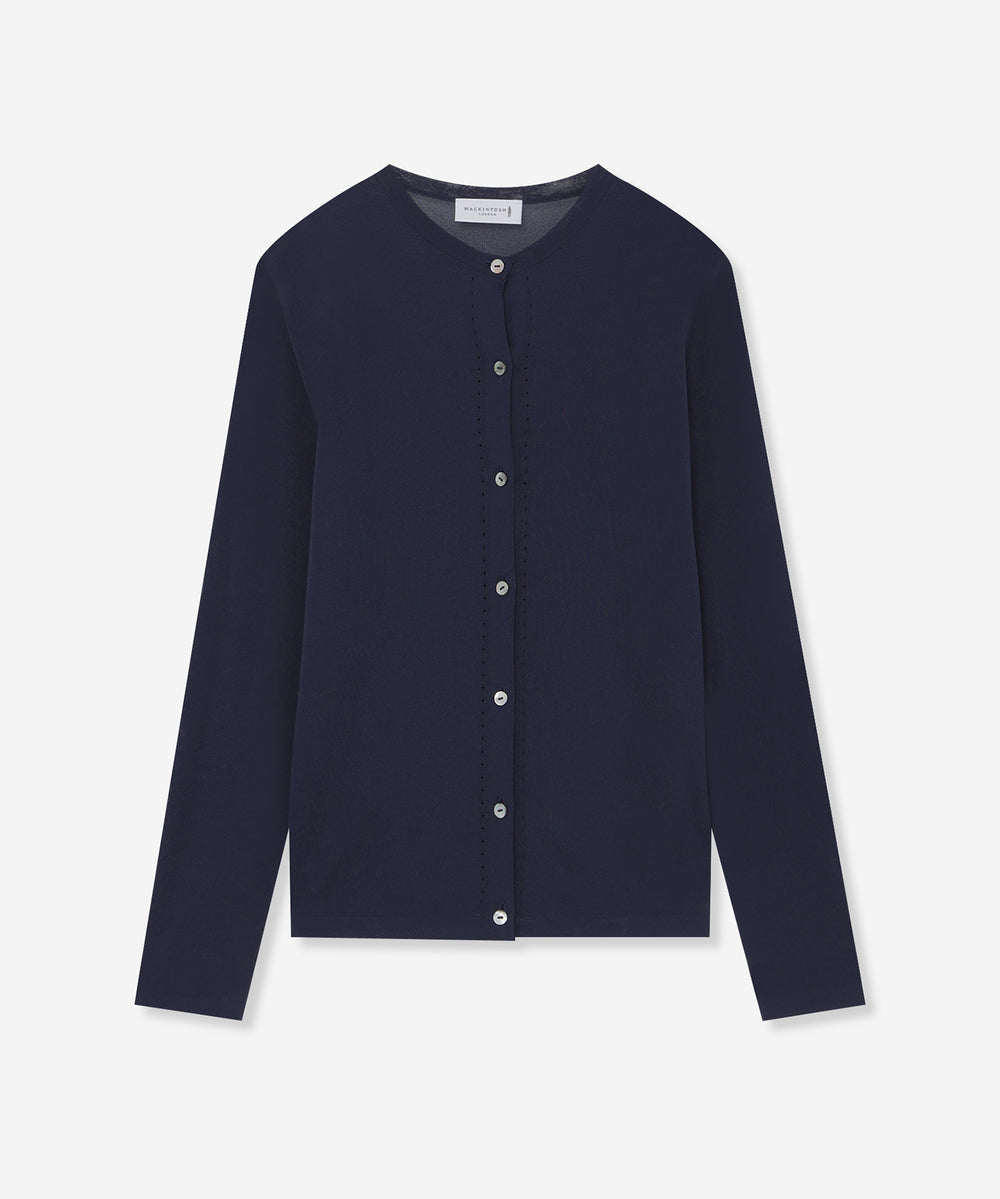 繊細なアイレットを前立てとサイドラインに施したシャープな印象のカーディガンです。ノースリーブなどの羽織に涼しげな印象のアイテムは春先から晩夏までご着用いただけます。