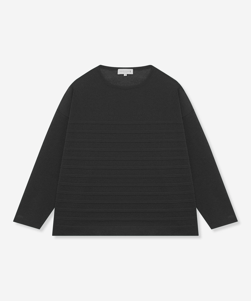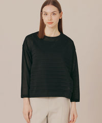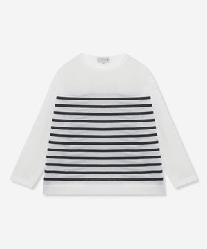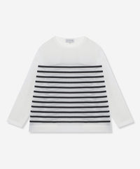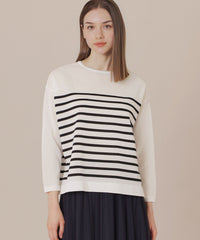 糸の特性を生かした透け感のある天竺組織と袋編みとの編地切り替えによりボーダーを表現したプルオーバーです。ゆったりとしたリラックスボディに控え目なボートネックと袖は八分丈で軽快な印象に仕上げています。