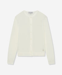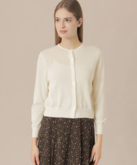 シンプルなニットショートカーディガンです。首に沿った小さな衿開きが繊細で、前立ての小さな釦もアクセントになっています。短い着丈と八分丈の袖が軽く涼しげな印象で、夏の羽織として活躍します。
