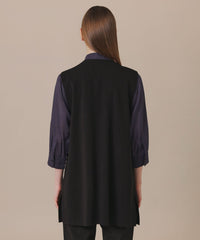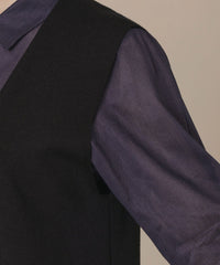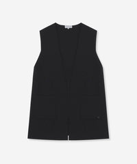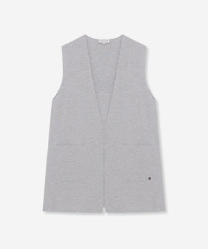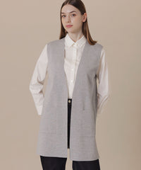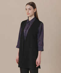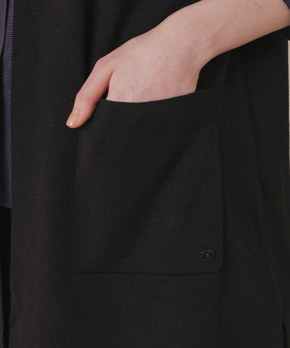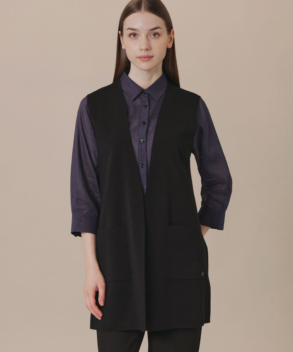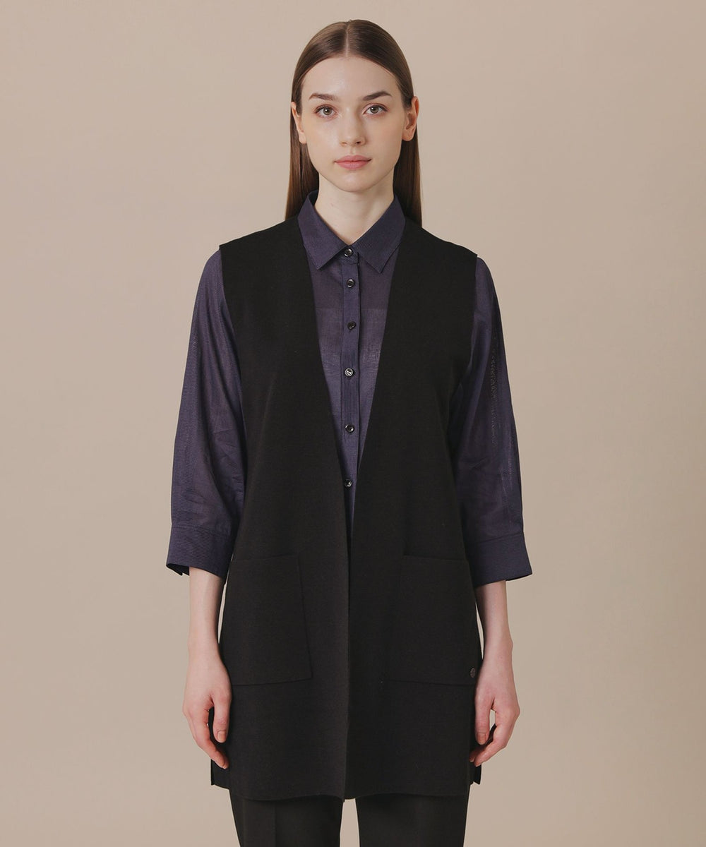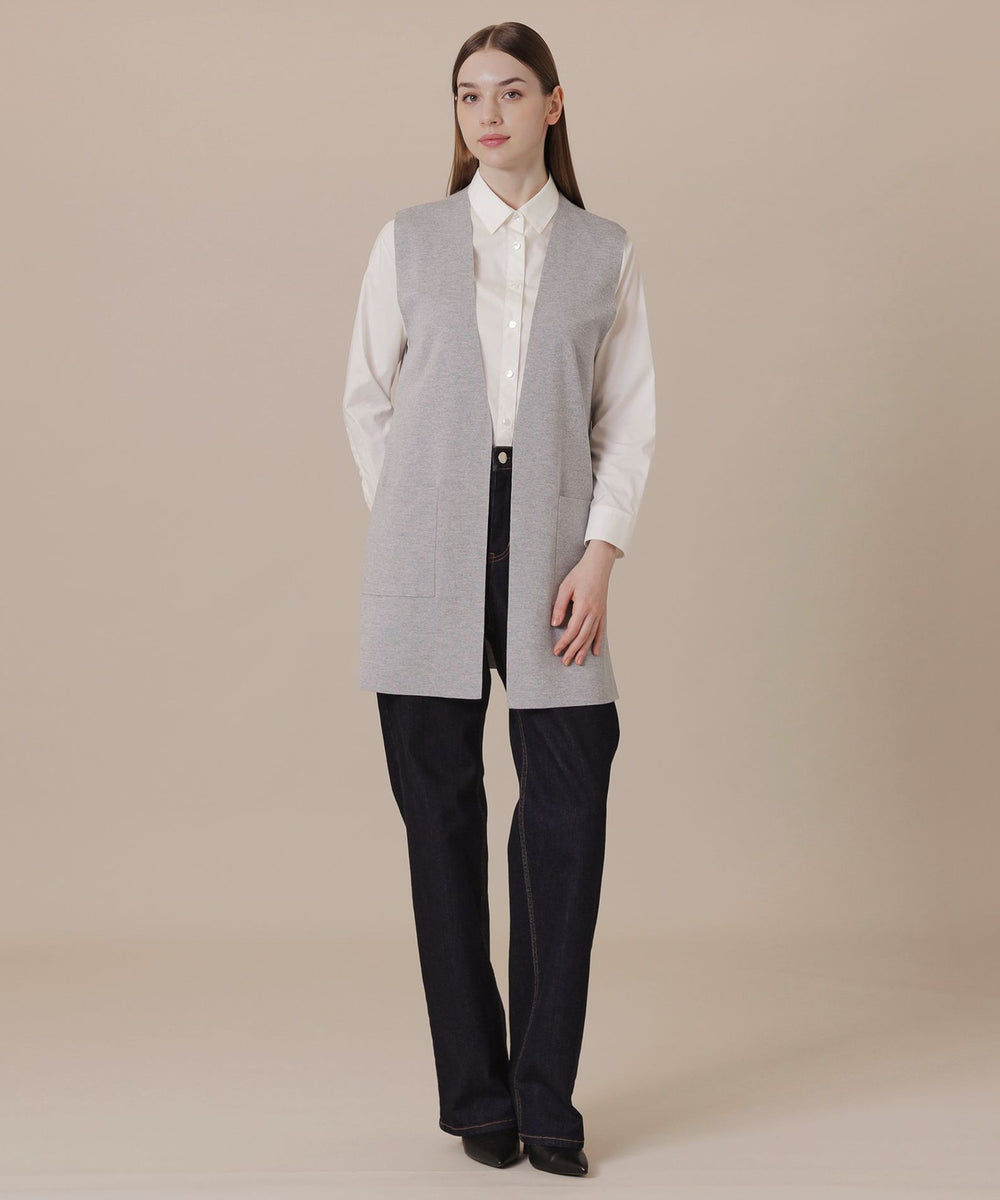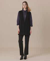 釦レスですっきりと仕上げたロングジレです。ブラウスやワンピースの上に羽織ったり、ニットやカットソーと合わせたり、様々なレイヤードルックが楽しめます。同素材のリブタートル(品番:G7N84685)、カーディガン(品番:G7N73685)もご用意しております。