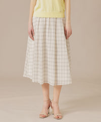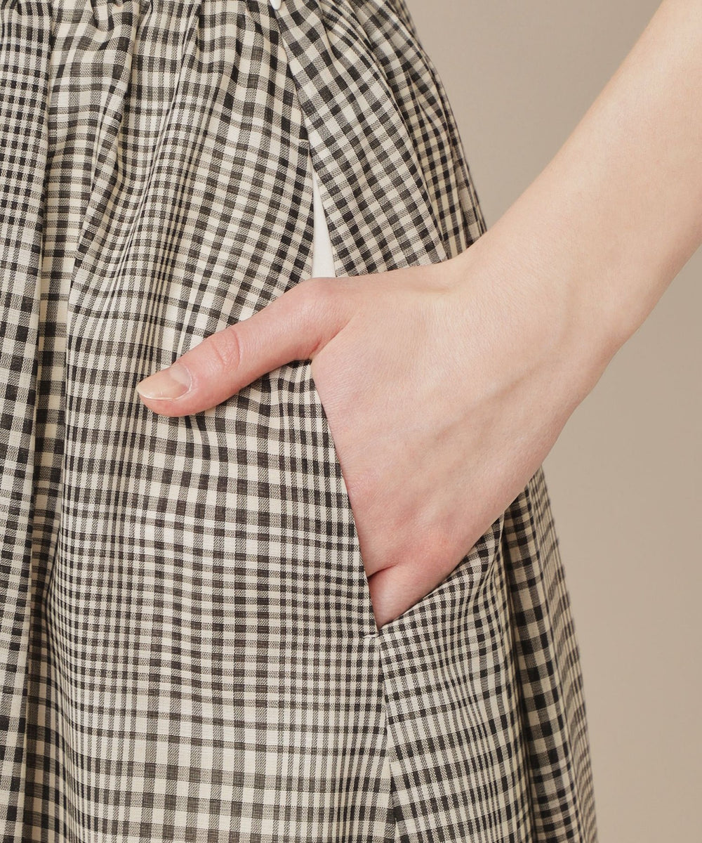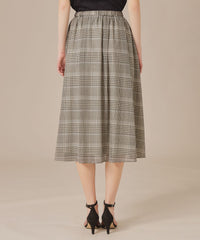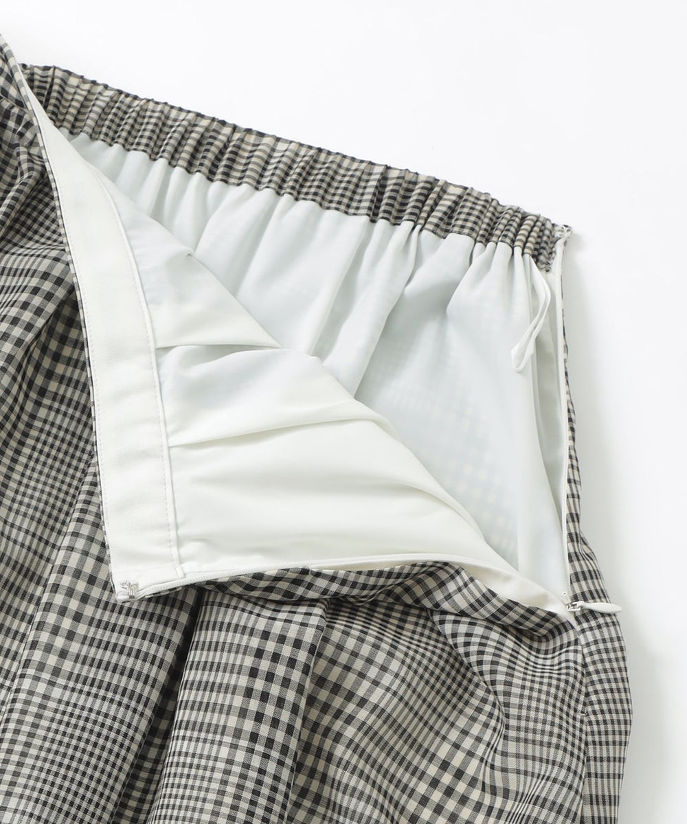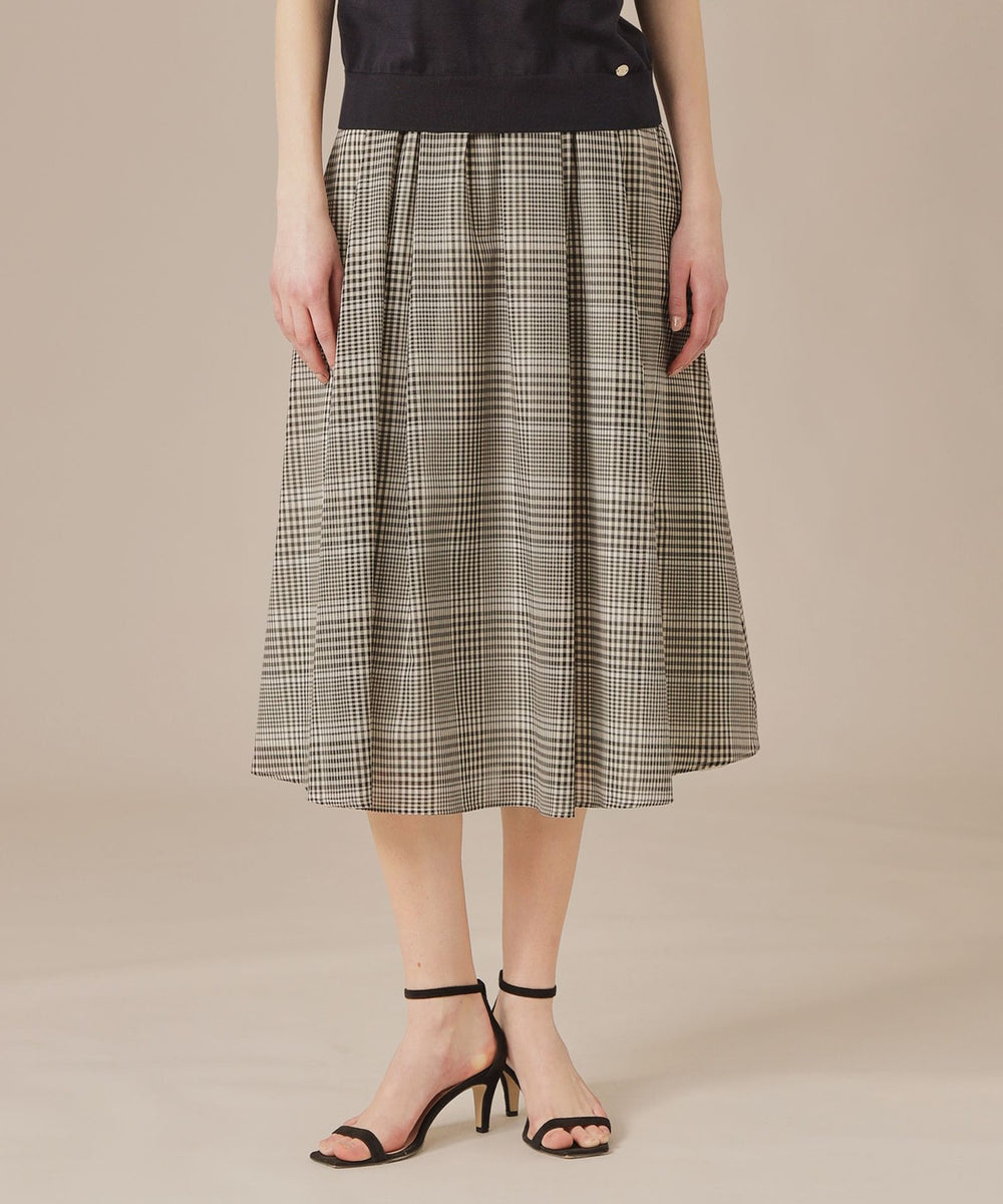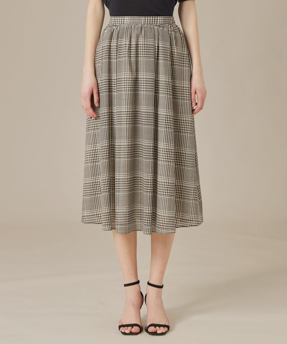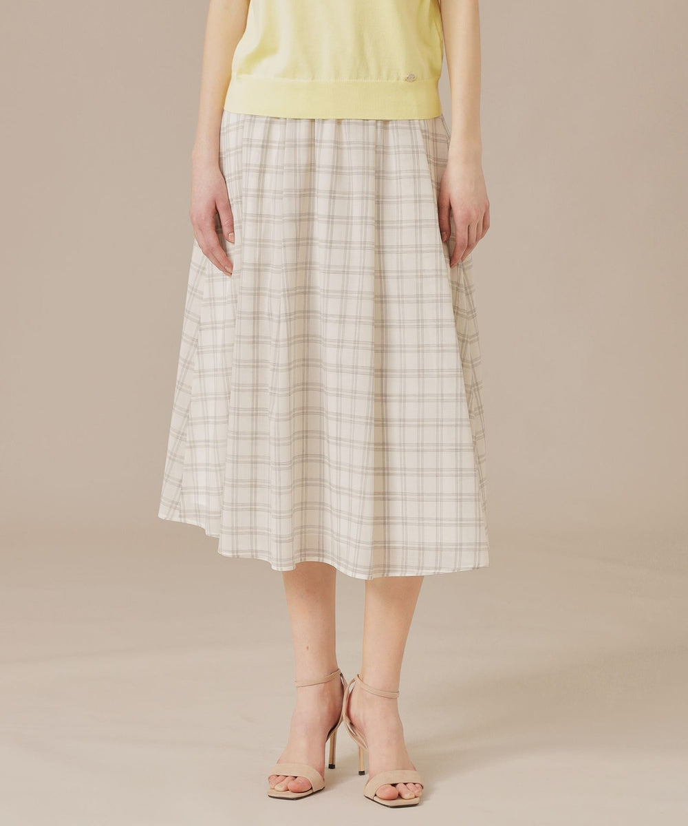腰回りのスッキリとしたタックギャザーのスカートです。裾に向けて優雅に広がるシルエットが軽やかなムードで、ウエスト後ろはゴム仕様で履き心地の良いアイテムです。裏地付きです。同素材のブラウス(品番G7M25539)もご用意しております。
