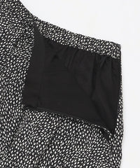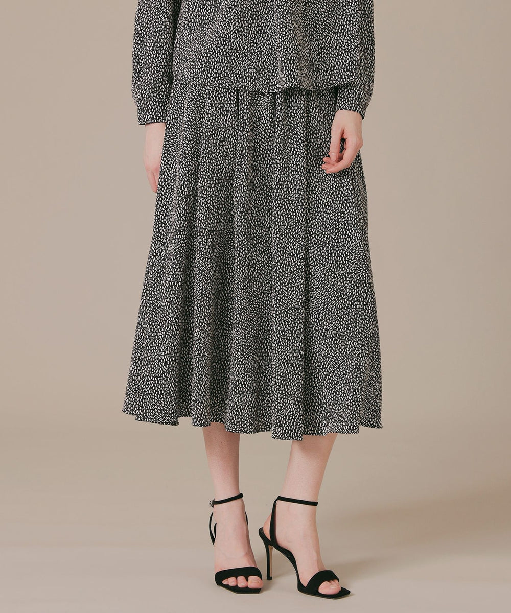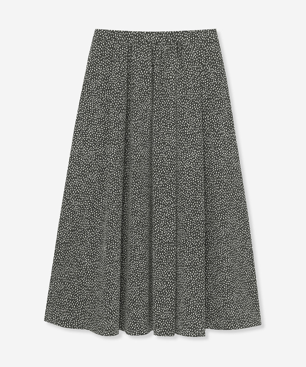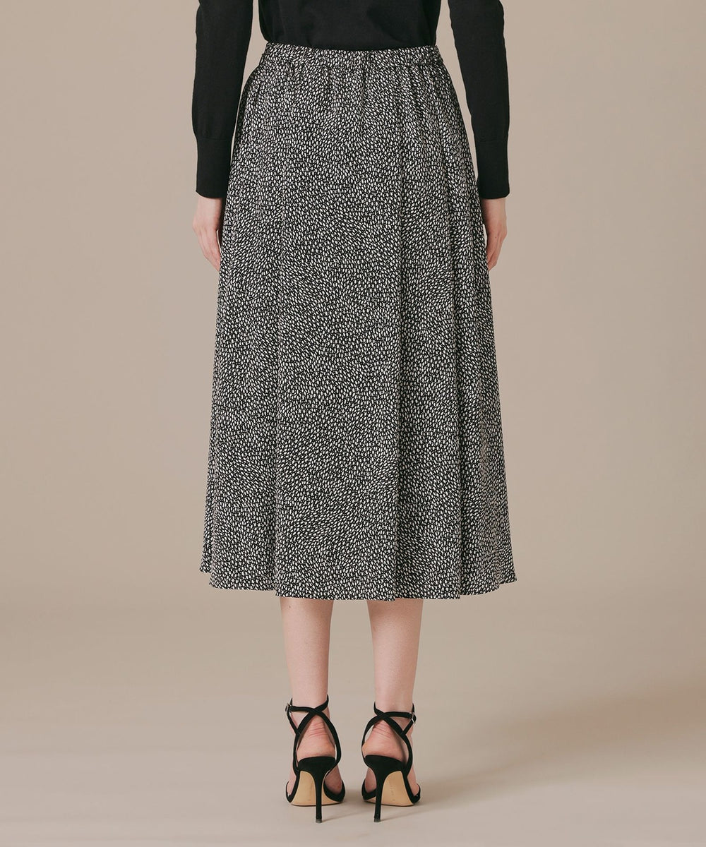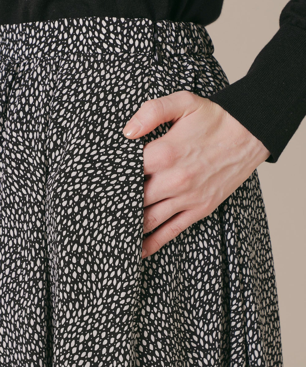 爽快なタッチと優れたドレープ性を持ち、透け感の少ない厚めのタイプのポリエステル素材に、繊細な変形ドット柄プリントを施した生地です。