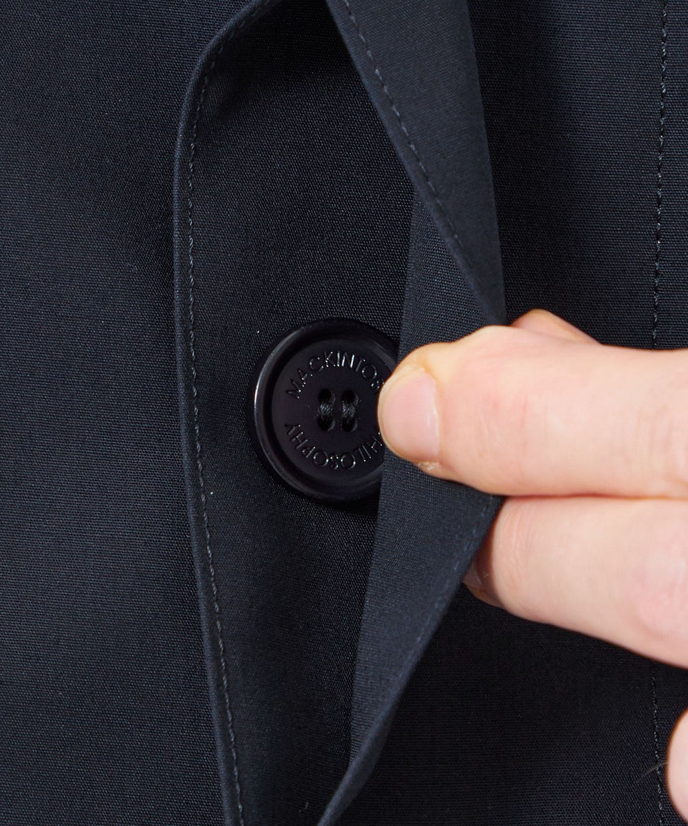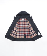 一体型フード付きモデル。ミリタリーウェアのムードとミニマムなムードが融合したモダンなデザイン。控えめなAラインで英国らしさを追求したシャープなシルエットながら着心地の良さも追求したパターンが特徴です。ディテールは三枚接ぎの立体フードは裏地を付けない一枚仕立て。ロゴ釦も生地色に合わせて染めた染ボタンを使用。脇下にはベンチレーション(ハトメ)付き。ハトメはフラットハトメでモダンな印象です。ウールライナーはマッキントッシュブランドのアイコンであるハウスチェックを使用。接ぎ(縫い合わせ)の無い1枚取りで贅沢に使用しています。