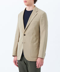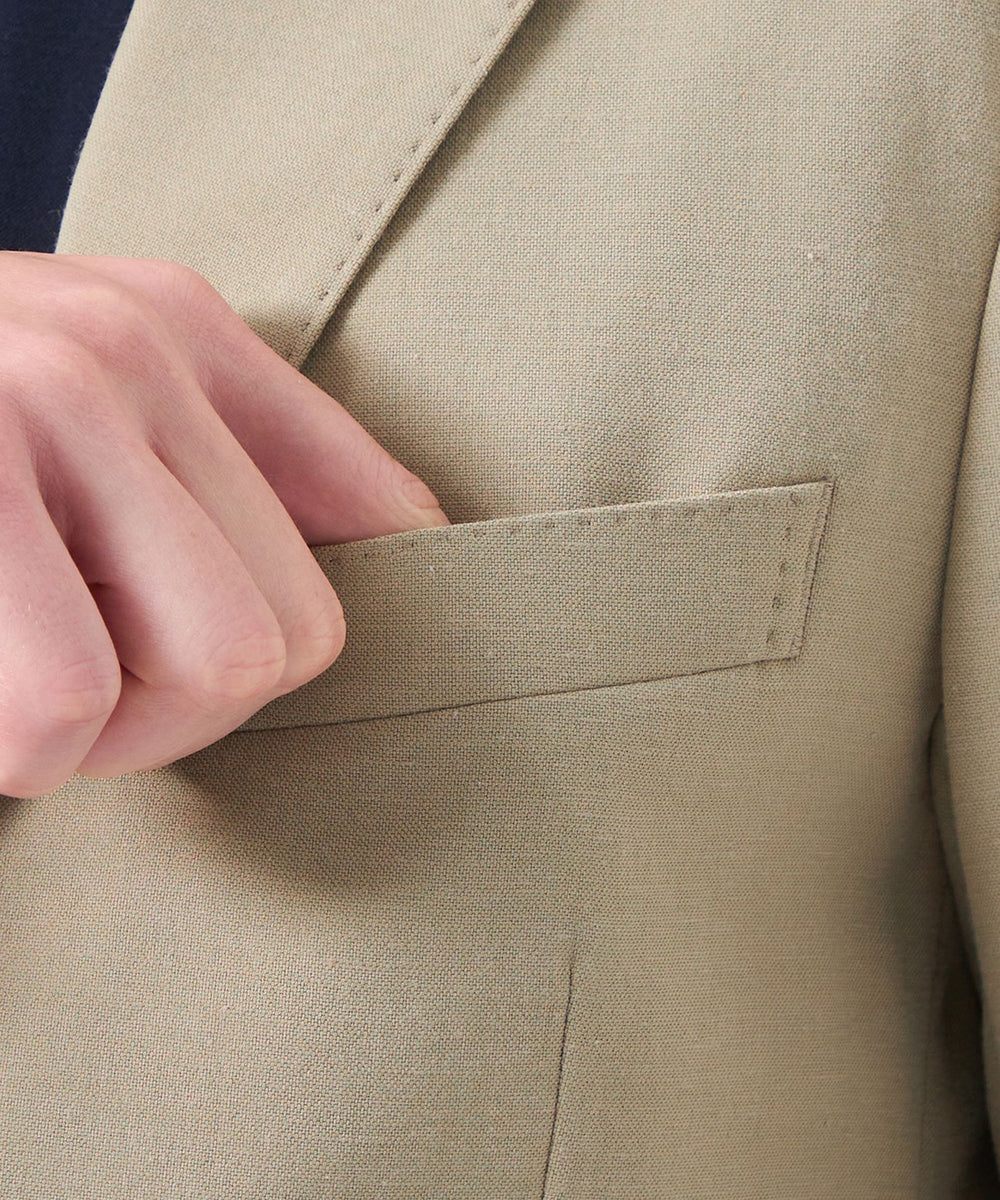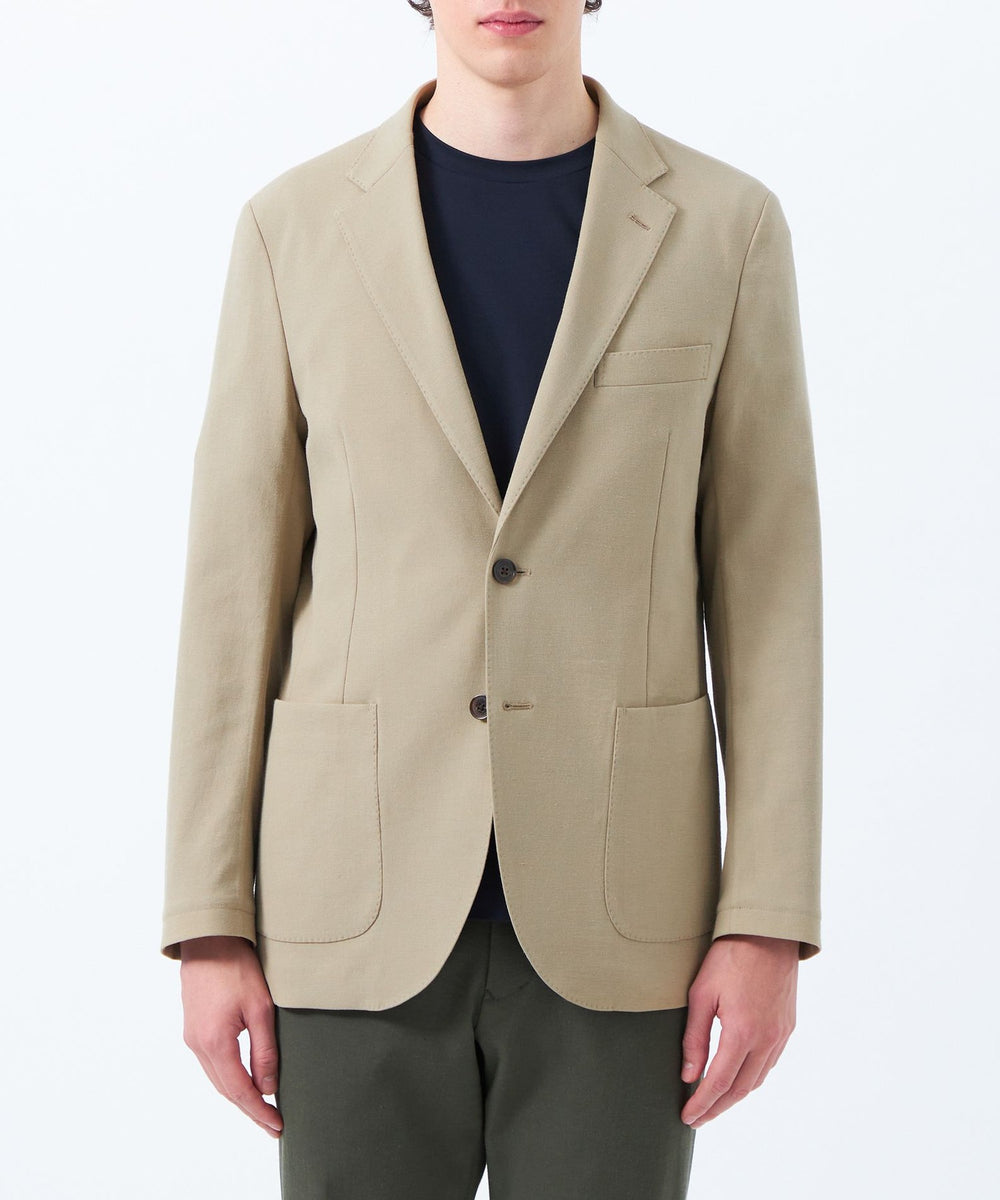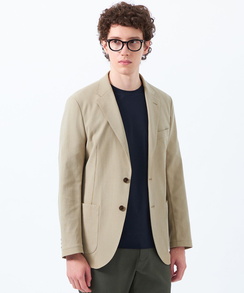 シングル2つボタンの腰パッチポケットデザイン。袖口3つボタン。内仕様は腰部分に片側ポケット付の大見返し仕様。背裏・袖裏のない軽やかなデザインです。