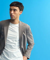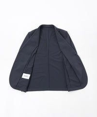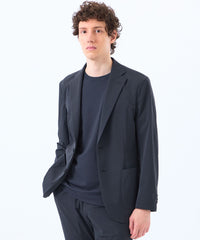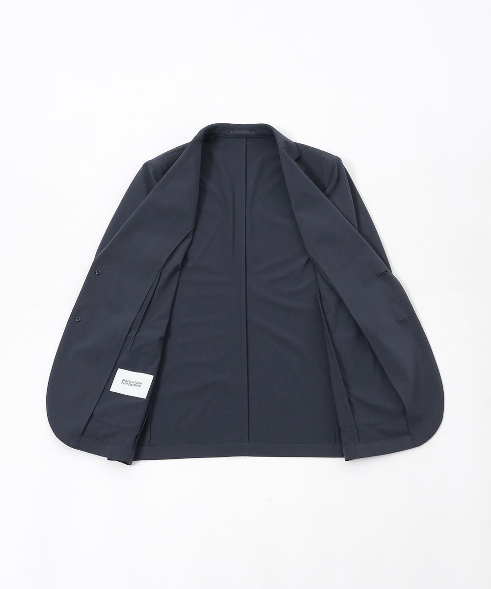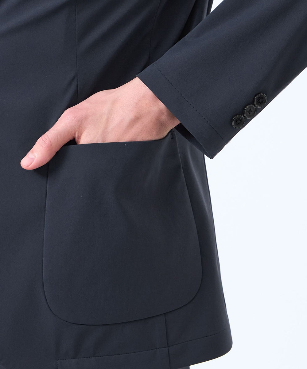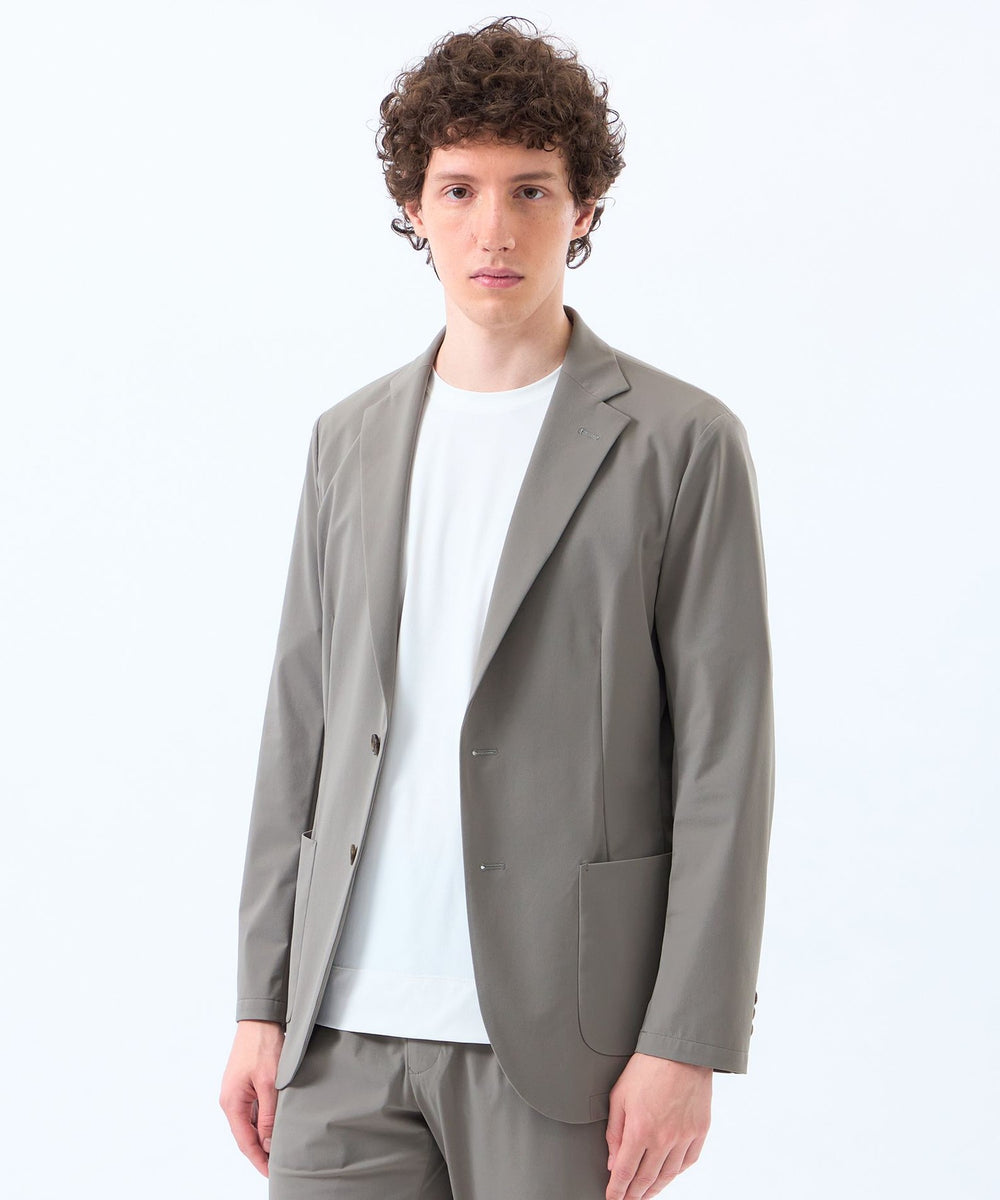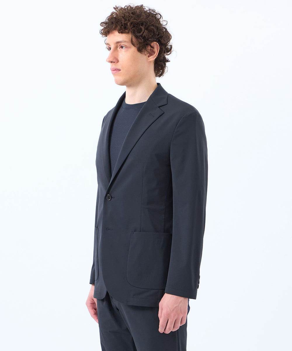 シングル2つボタン、パッチポケットモデル。ベントが無く、背裏・袖裏も無い一枚仕立てなのでカーディガン感覚で羽織れるジャケット。芯地の使用も最低限に抑え、軽さを意識したデザインです。