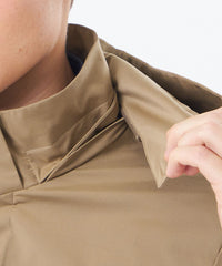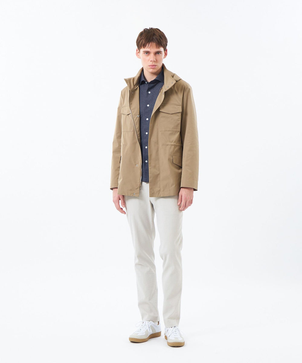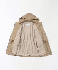 スタンドカラーとフーデッドの2WAY仕様で着こなせるコート、BELFAST(ベルファスト)の新型、「BELFAST ミリタリーパーカ」。 ミリタリーアウターの4つポケットデザインと、内側のウエストドローコード仕様を採用したモダンなデザインです。ジャケットの上からも羽織れる着丈に設定しています。フードを付ける際は、襟先から一体になる仕様で、フードの収まりが非常に良く立体的に立ち上がるため、スタイリッシュな印象です。フロントはジップアップ+隠しドット釦仕様。総裏仕様で、両胸に内ポケット付き。