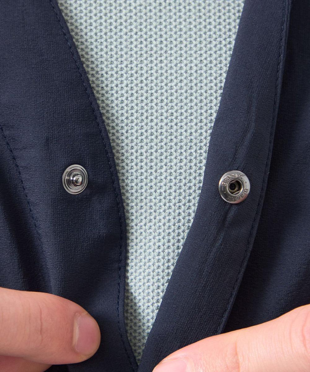 20デニールのナイロン素材でブラックとネイビーの2色展開。ブラックに関しては糸の選定、染色、加工の3段階で工夫を重ね「通常の黒よりもさらに深みのある色合い」の「真の黒」を実現した「BLACK OF BLACKs(ブラック オブ ブラック)」の生地を使用しています。