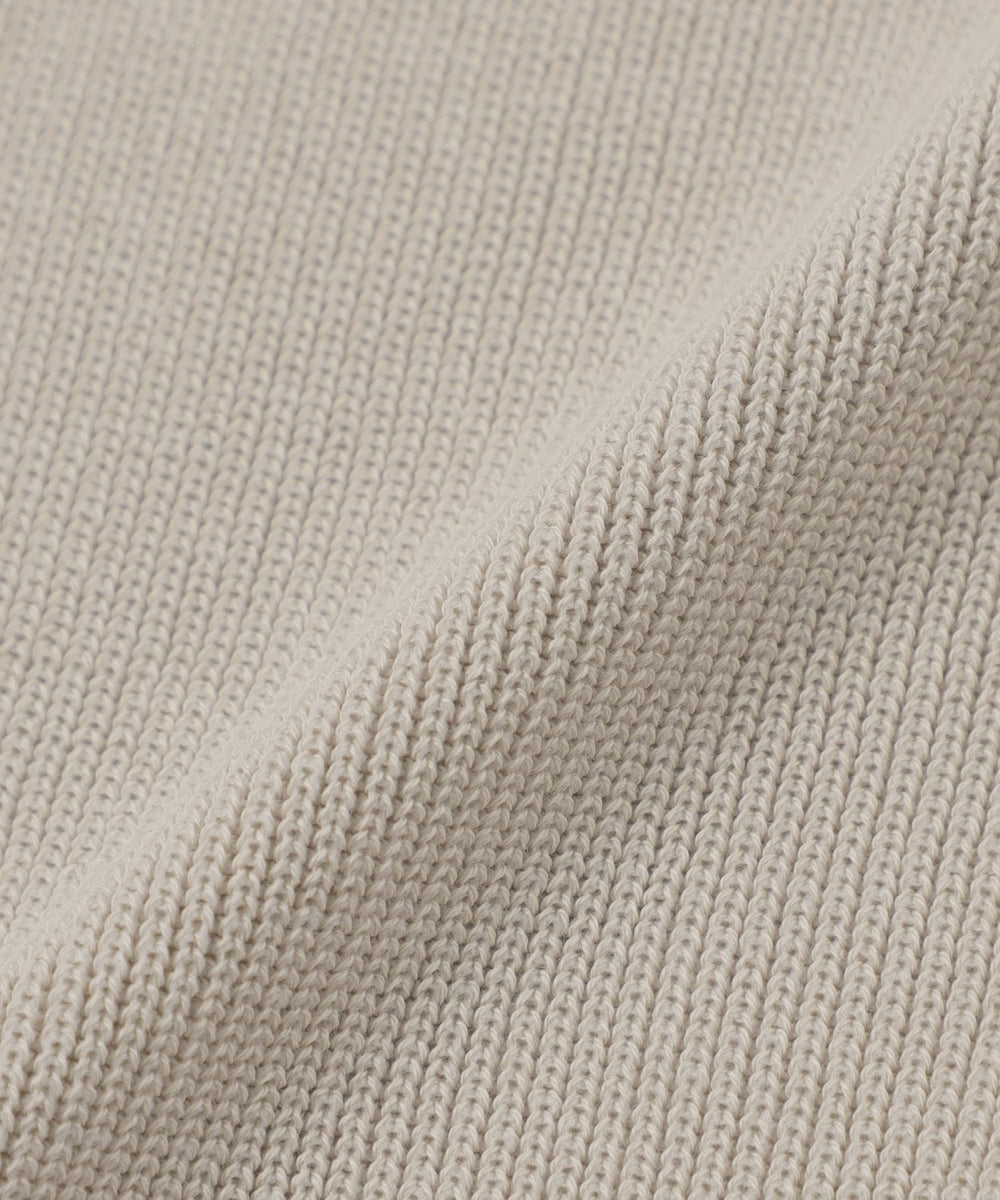 綿/ポリエステルにプレーティングをした片畦素材。擬麻(ギマ)加工を施し、ドライタッチで肌離れの良い麻のような風合いに仕上げました。毛羽の少ないクリアな表情も特徴で、長いシーズンご着用いただける素材感です。