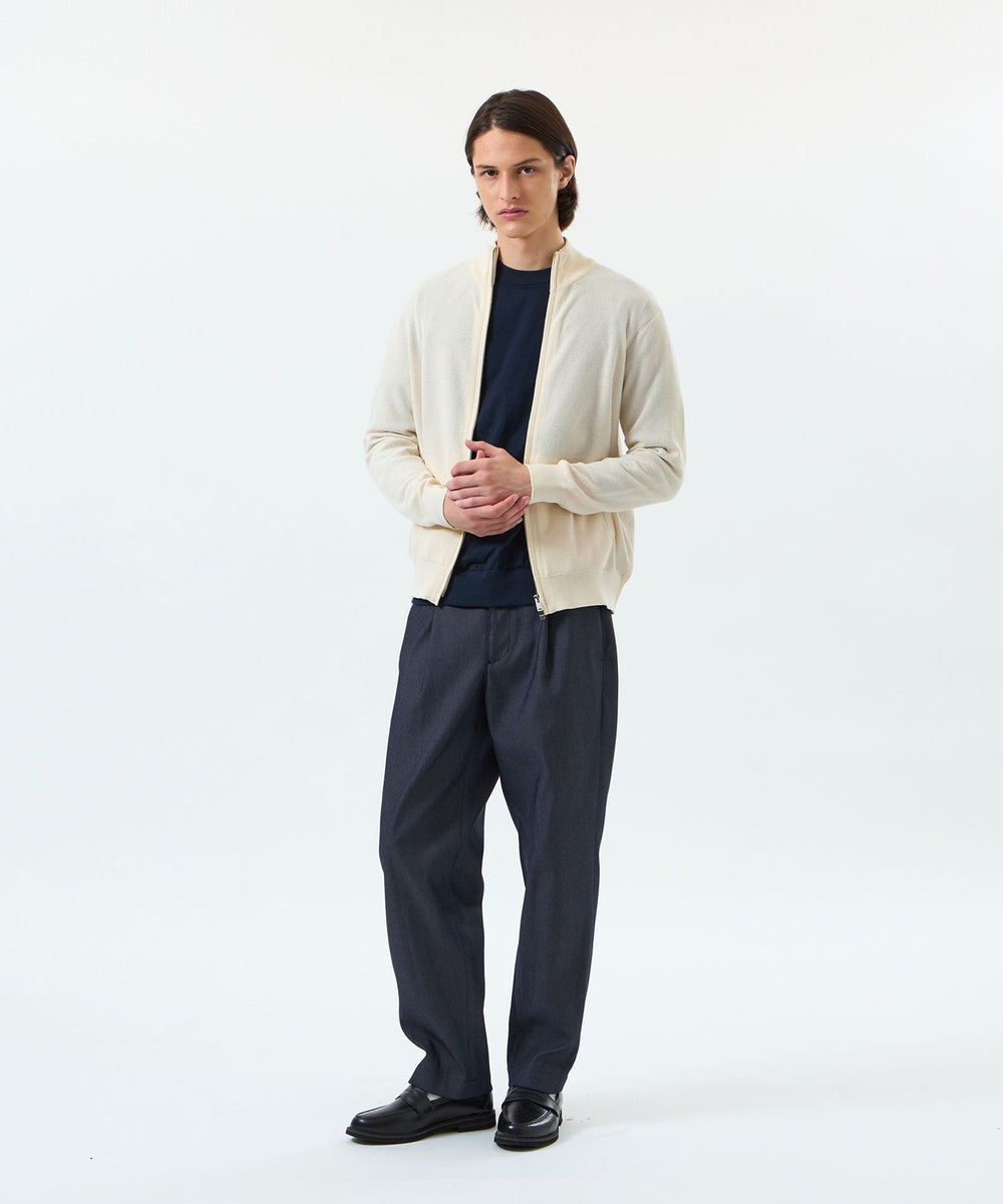 ジップにオリジナルスライダーを使用したスタンドカラーデザインのジップアップニットです。秋口には羽織りとしてカットソーやシャツのアウターとして活躍します。またアームホールをコンパクトな設計にしているため、アウターやジャケットのインナーとしてもコーディネート可能です。