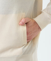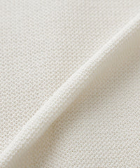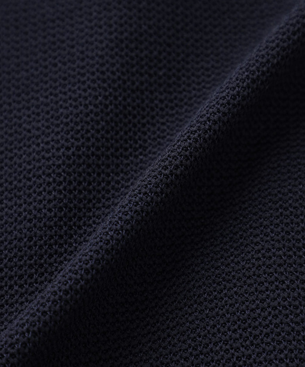 麻に似せた硬く乾いた風合いでサラサラした肌触りが特徴の擬麻(ギマ)加工をした綿にポリエステルをプレーティングしたジャカード編み素材です。肌離れの良いドライな質感でシーズン長く着用いただけます。