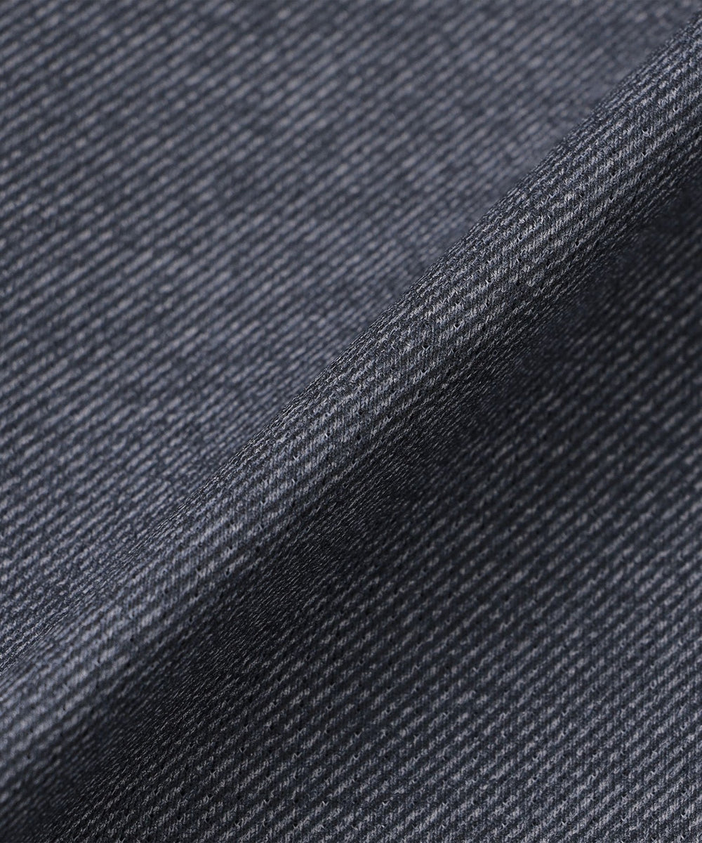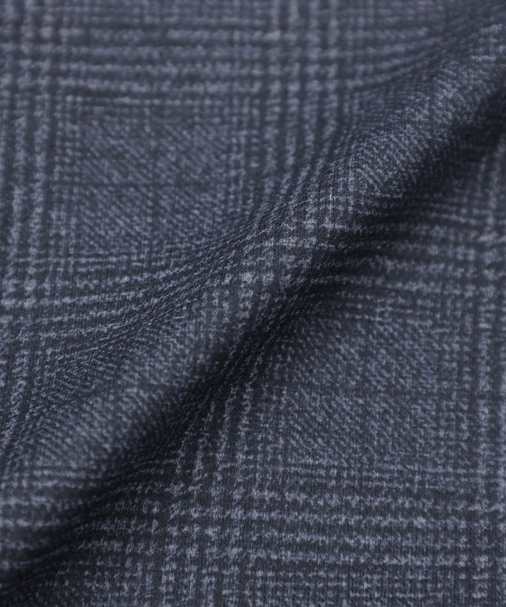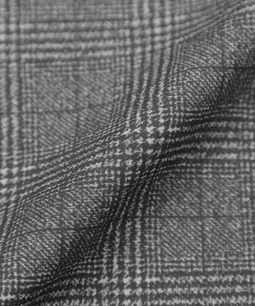 穴の開いたメッシュ組織のポリエステルジャージ素材をベースにツイルとグレンチェックのプリントをした軽量生地です。ストレッチ性にも優れているため快適な着用感で、かつ適度なハリ感もあるため仕立て映えする素材です。