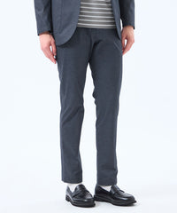 ウェスト後ろゴム仕様のエラスティックパンツ。ベルトなしでも穿けるリラックスした穿き心地ながら前身はすっきりとした見た目のON/OFF兼用で使えるパンツです。