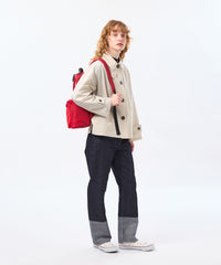 小ぶりな衿と上目に配したフロントボタンのバランスで、全体的にコンパクトな印象に仕上げています。ゴールドスタッズでクラス感のあるチンフラップ付きで、衿を立ててチンフラップを閉じると、モードな印象に。