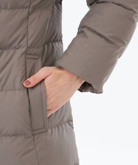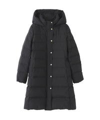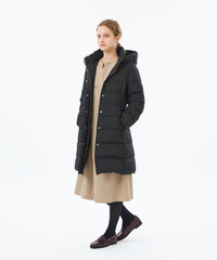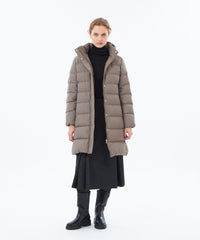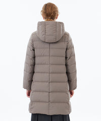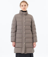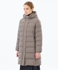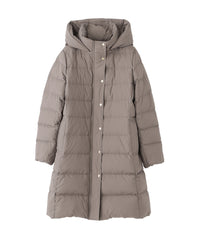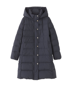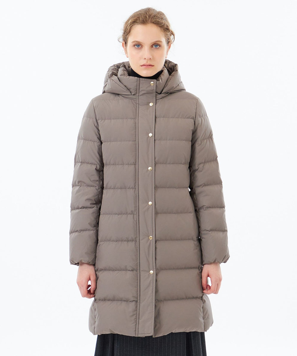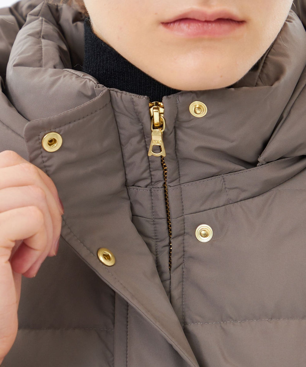 ゆるやかなAラインシルエットのロングダウン。適度にゆったりとした身頃に肩回りから袖にかけて動きやすさが考えられたパターン設計で着心地の良さを実現。フードが取り外せる仕様になっており、スタンドカラーコートとしてもご着用いただけます。