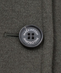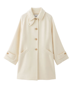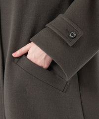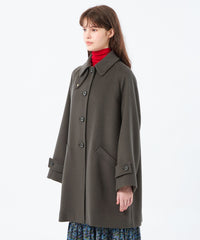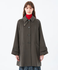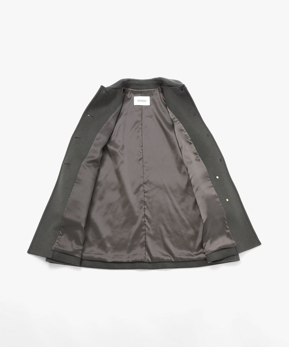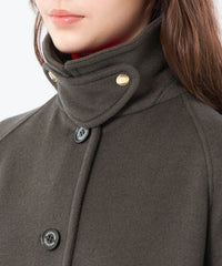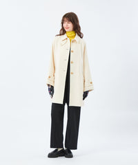 小ぶりな衿と上目に配したフロントボタンのバランスで、全体的にコンパクトな印象に仕上げています。ゴールドスタッズでクラス感のあるチンフラップ付きで、衿を立ててチンフラップを閉じると、モードな印象に。※コート内側にチンフラップの収納用スナップボタンが付いています。