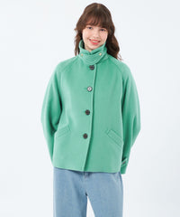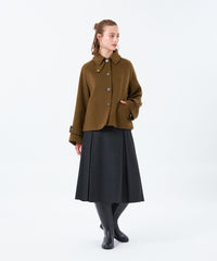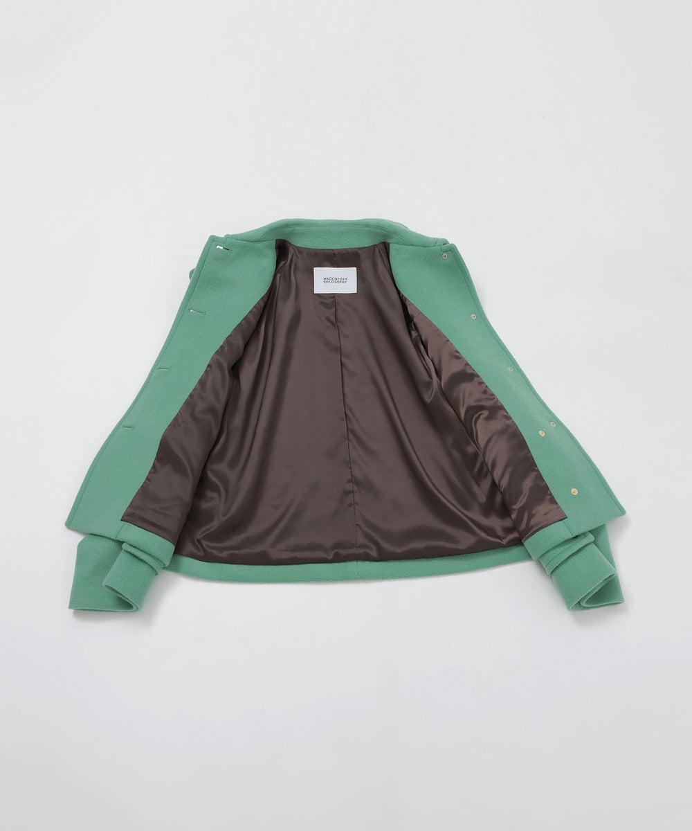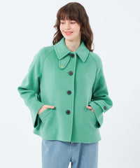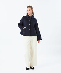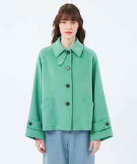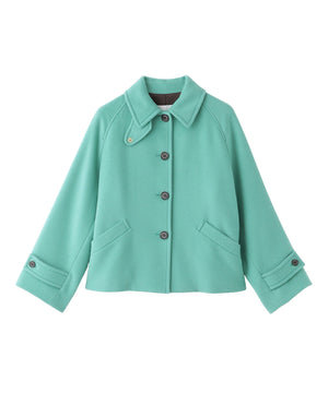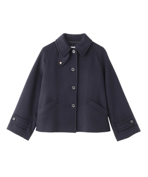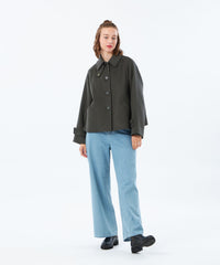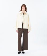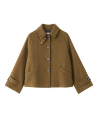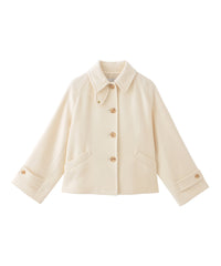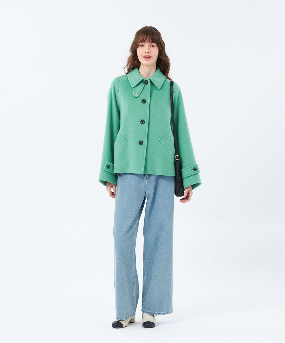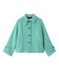 小ぶりな衿と上目に配したフロントボタンのバランスで、全体的にコンパクトな印象に仕上げています。
