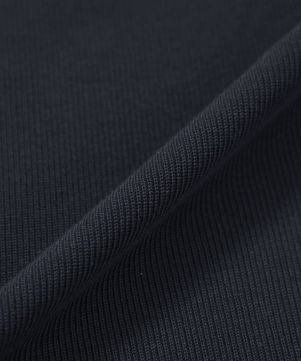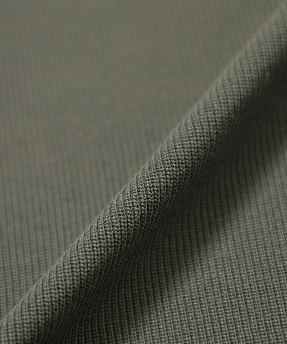 肌触りの良いさらっとしたタッチと見た目以上の軽さが魅力。毛羽の少ない特殊な紡績糸を使うことでニット見えのするカットソー素材です。