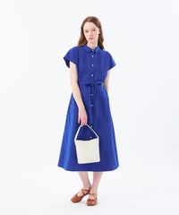 ほどよくハリのある生地なので、Aラインシルエットが美しく出るとともに、共地リボンでウエストマークすることで、フィット&フレアのすっきりシルエットでも着用が可能です。