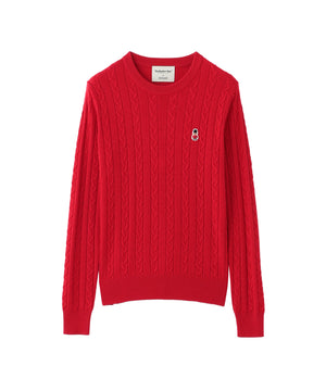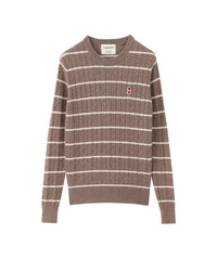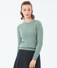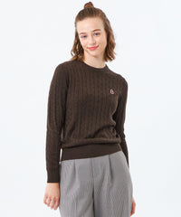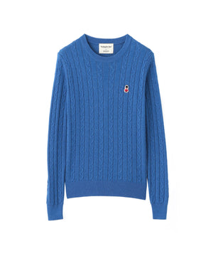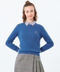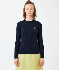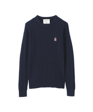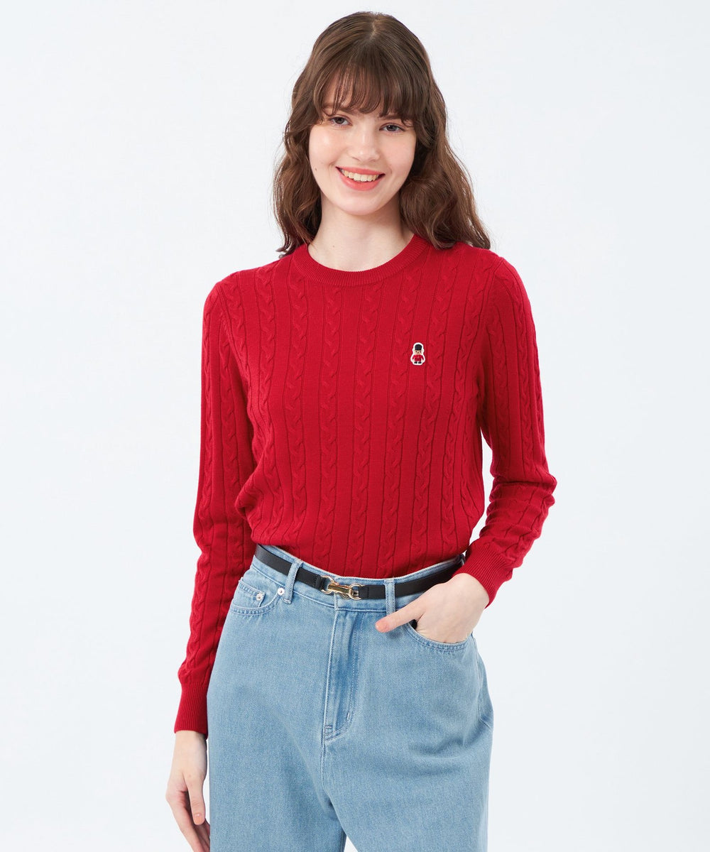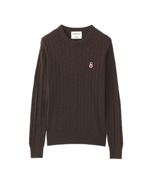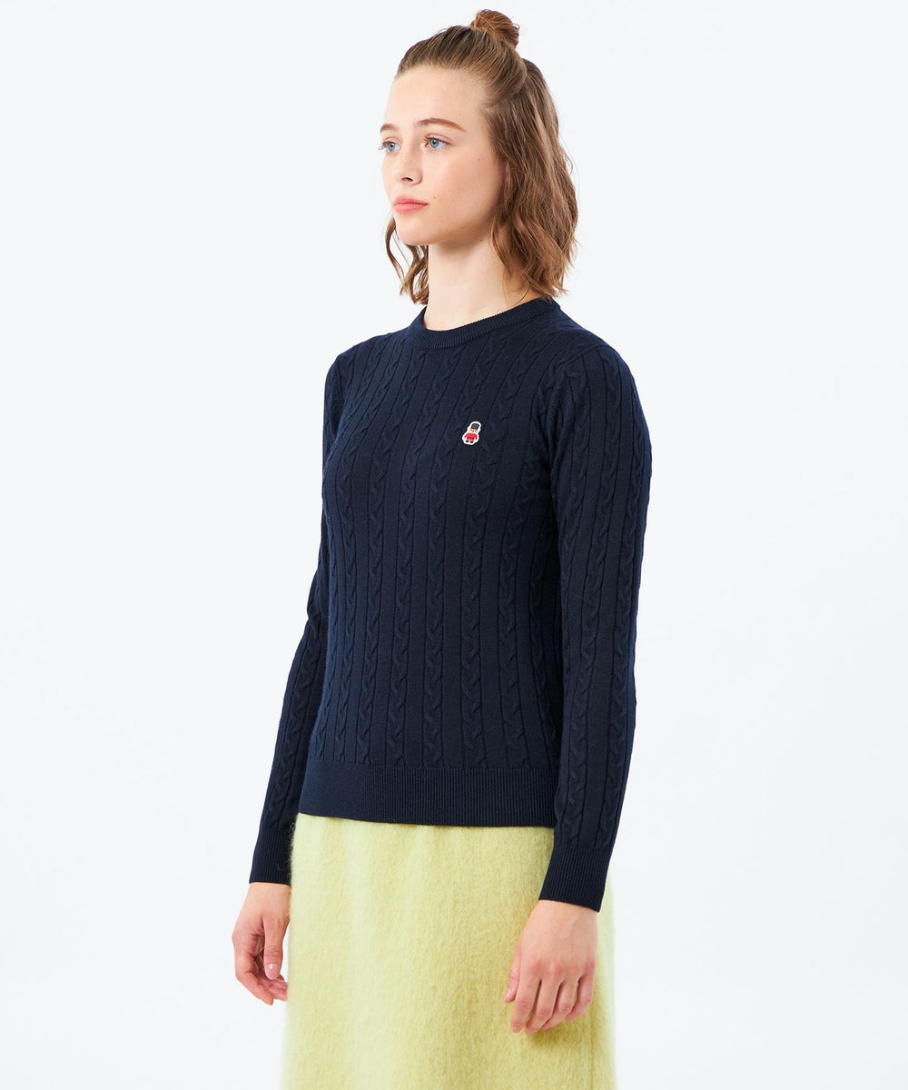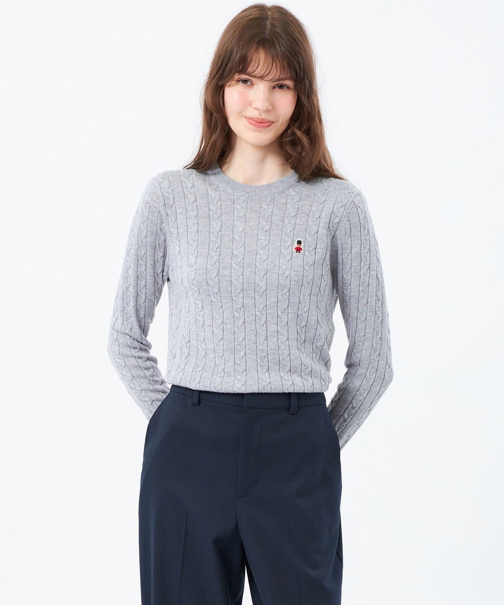 胸元のワッペンがアクセントのクラシックなケーブルニットプルオーバー。