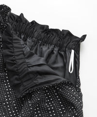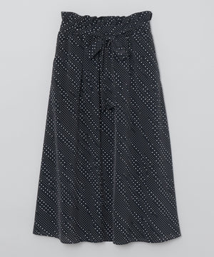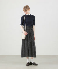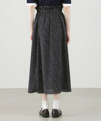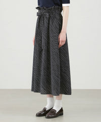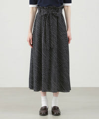 長めのレングスでたっぷりとボリュームのあるフレアスカート。さらりとしたドライタッチな素材感とバッグウエストのゴム仕様で、ストレスフリーな着心地。附属のリボンやお手持ちのベルトでウエストマークが可能です。