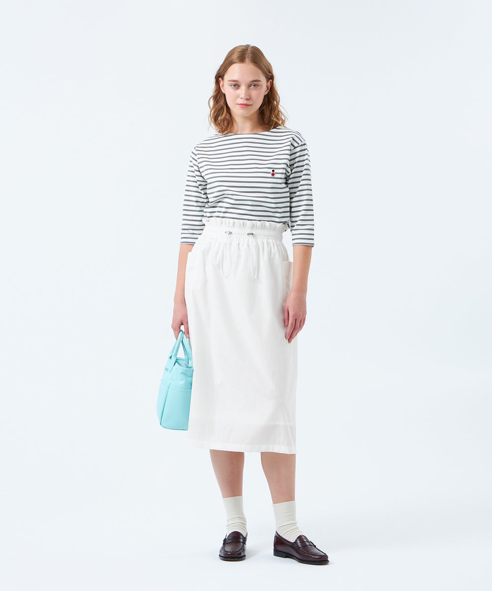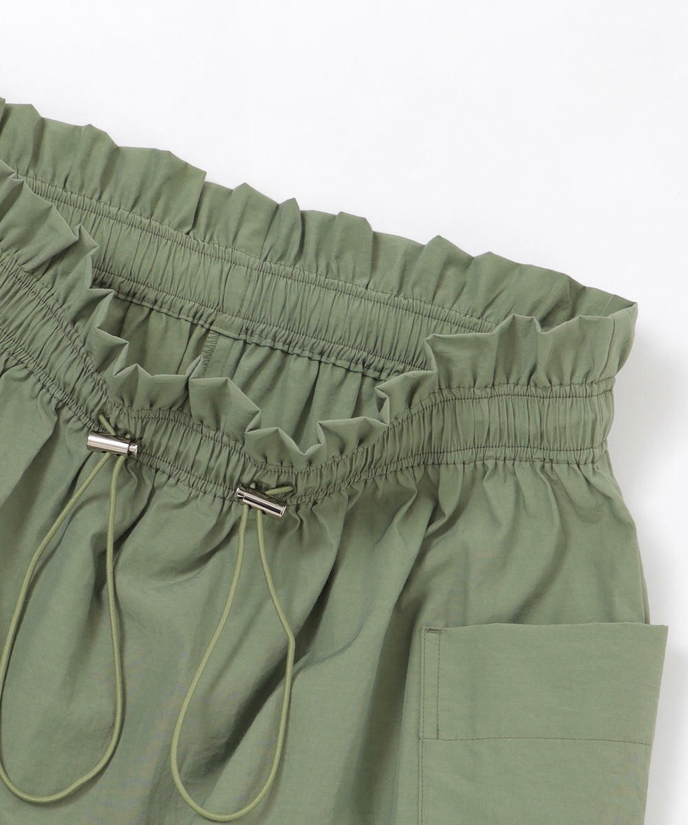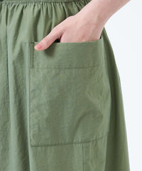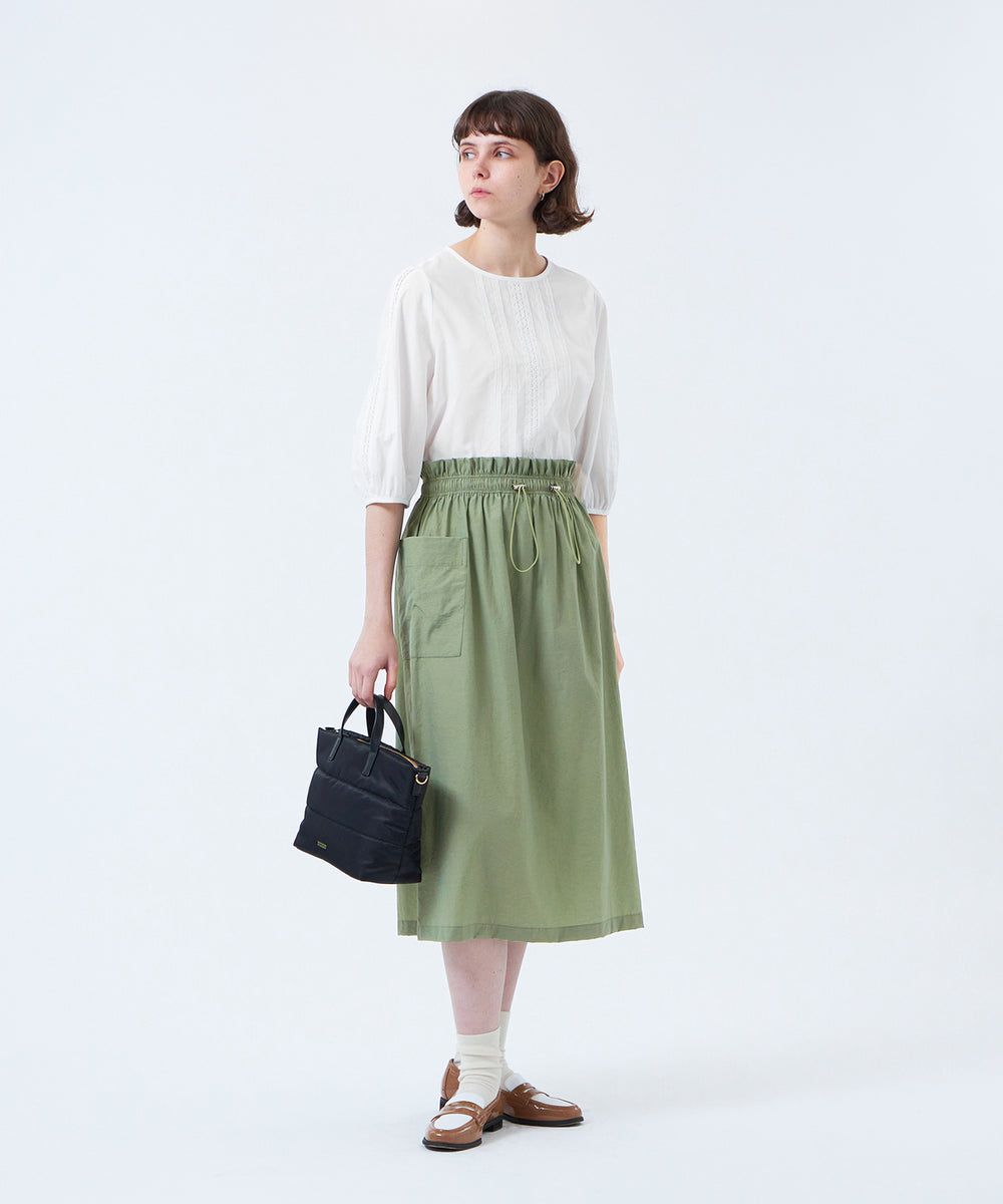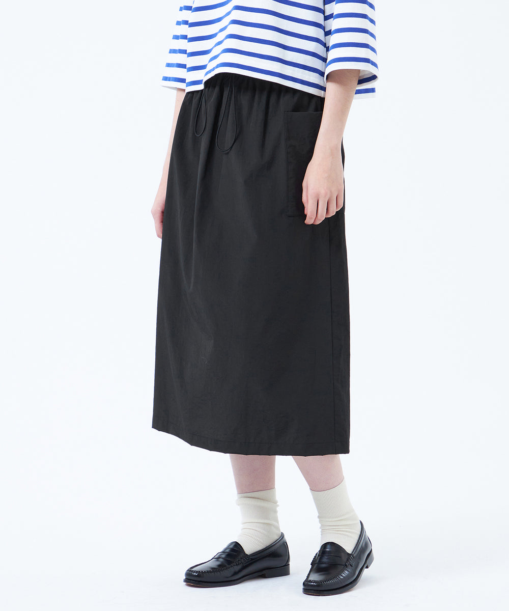 大きめのサイドポケットとウエストギャザーがポイントのドロストスカート。