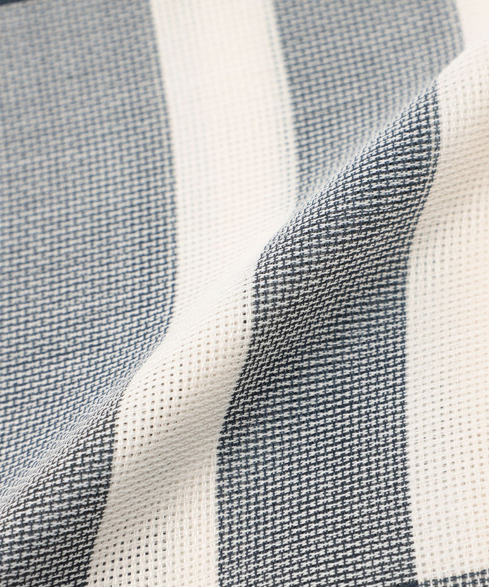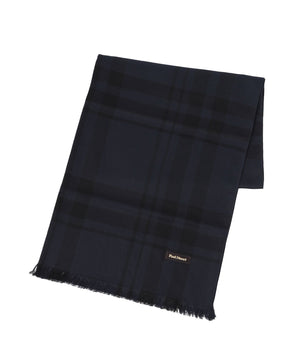 大き目のチェック柄の入った清涼感の感じられる素材感のストールです。