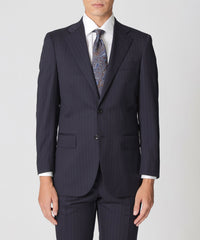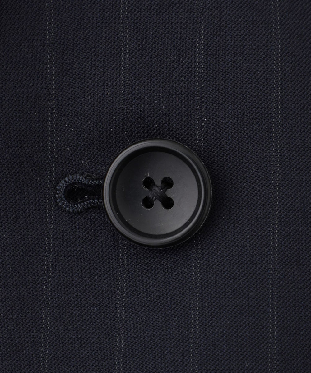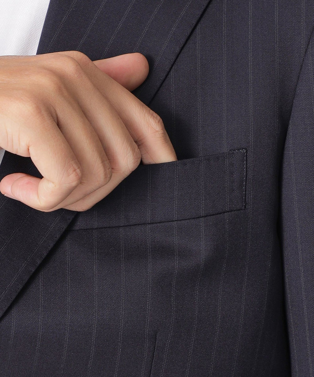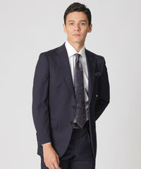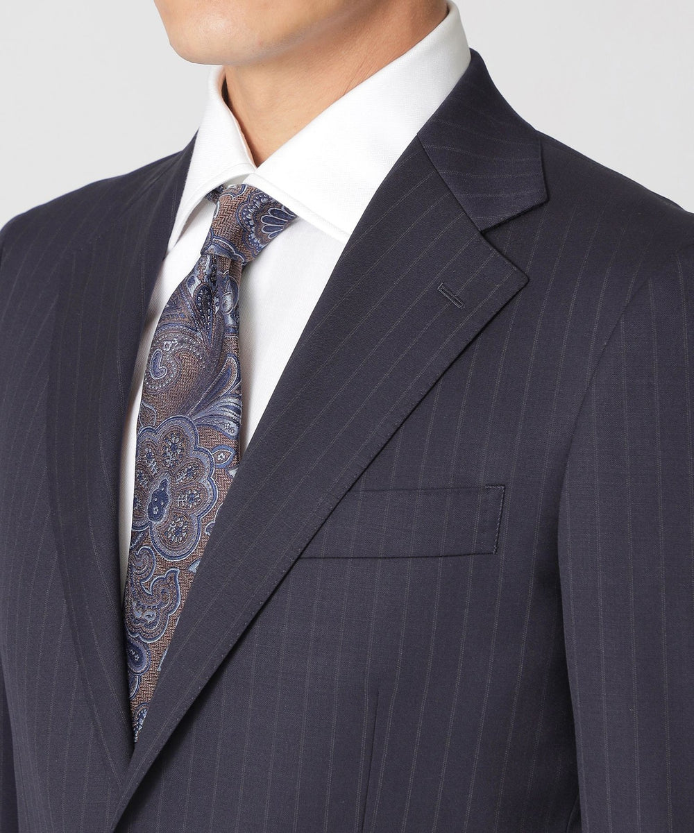 グランドカラーに馴染むフェードストライプが落ち着きのある印象を与え、品格のあるスーツに仕上がっています。
