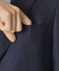 ノッチドラペル、シングル前、2ボタン、サイドベンツ、胸箱ポケット、腰水平フラップポケット、背抜き仕立て