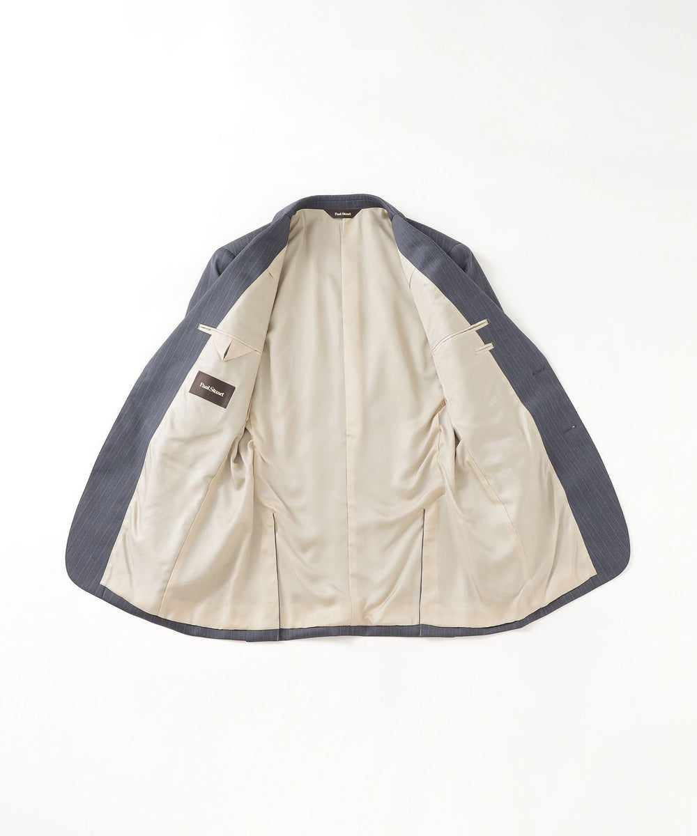 ポール・スチュアートオリジナルの5色の綿を(わた)をブレンドしたグレイッシュブルーが特徴的なストライプ柄のスーツ。