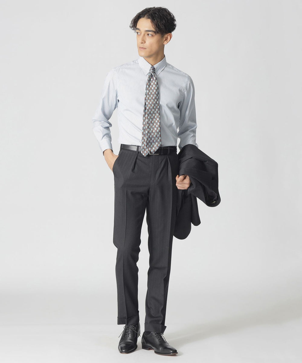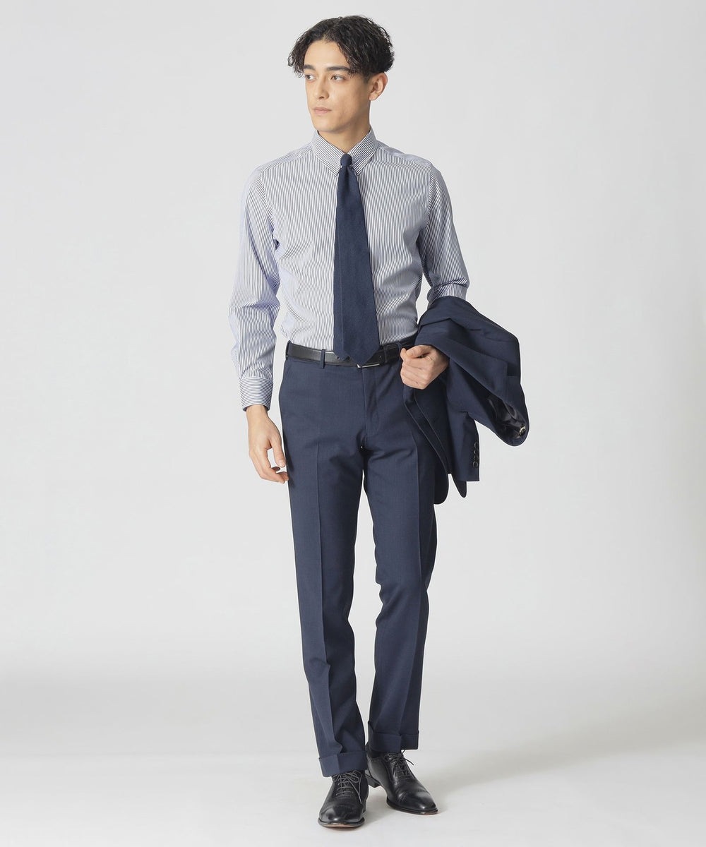 ビジネス~オケージョンシーンをカバーするTPOに則った襟デザインです。少しソフトな襟芯を使用し、よりナチュラルな雰囲気にしています。"
