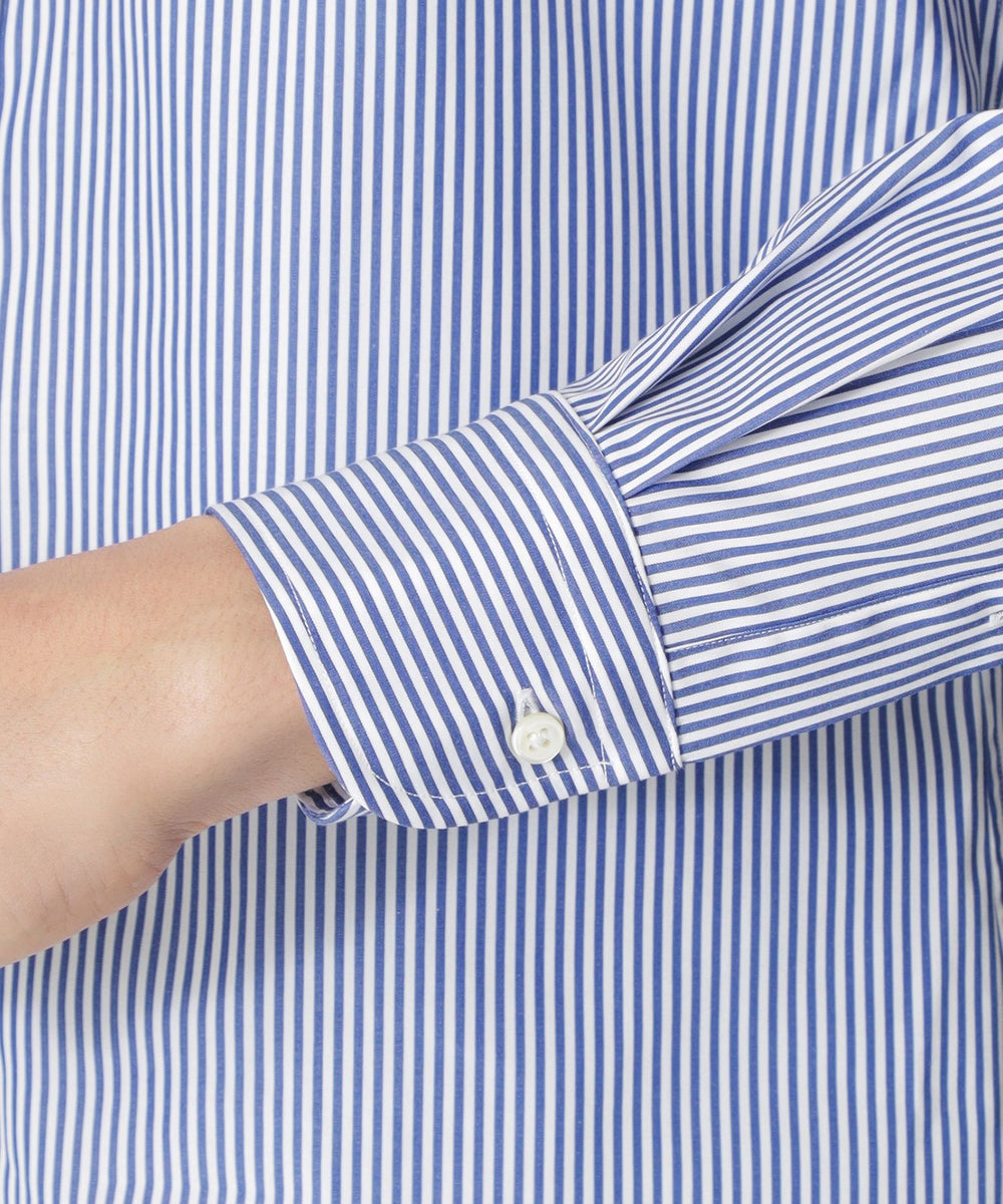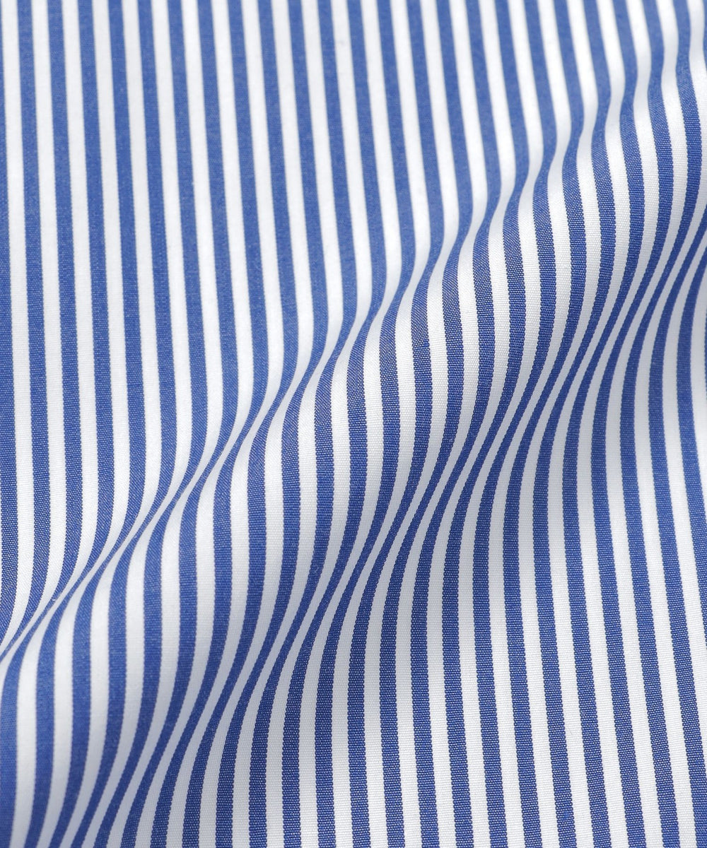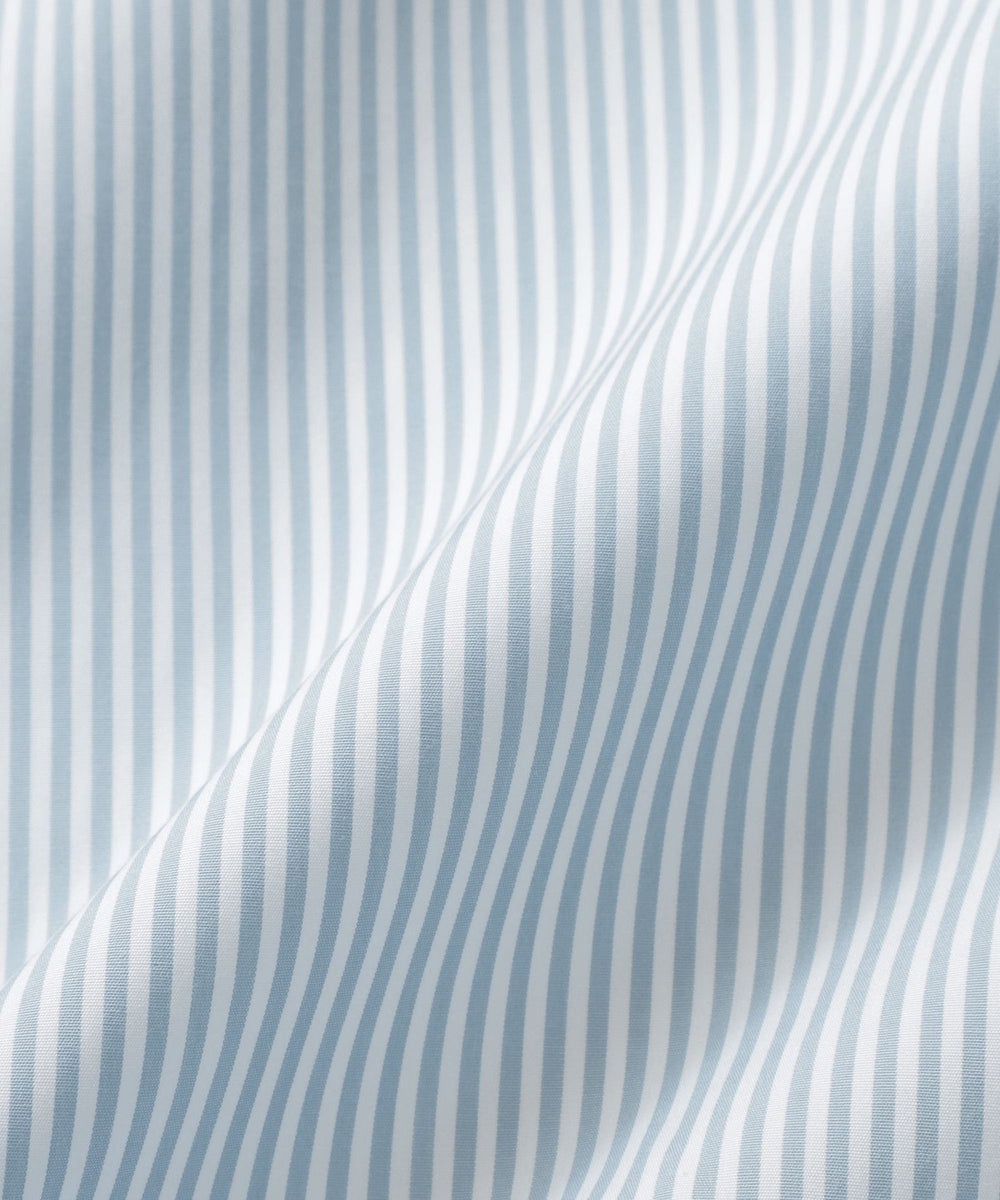 経緯共に超長綿コンパクト糸の細番手(100/2)を使用し、毛羽が少なく、発色、光沢の良いなめらかな風合いが特徴です。一般的なストライプに比べ経本数を2割ほど多くすることではっきりとした美しいラインに仕上がっています。