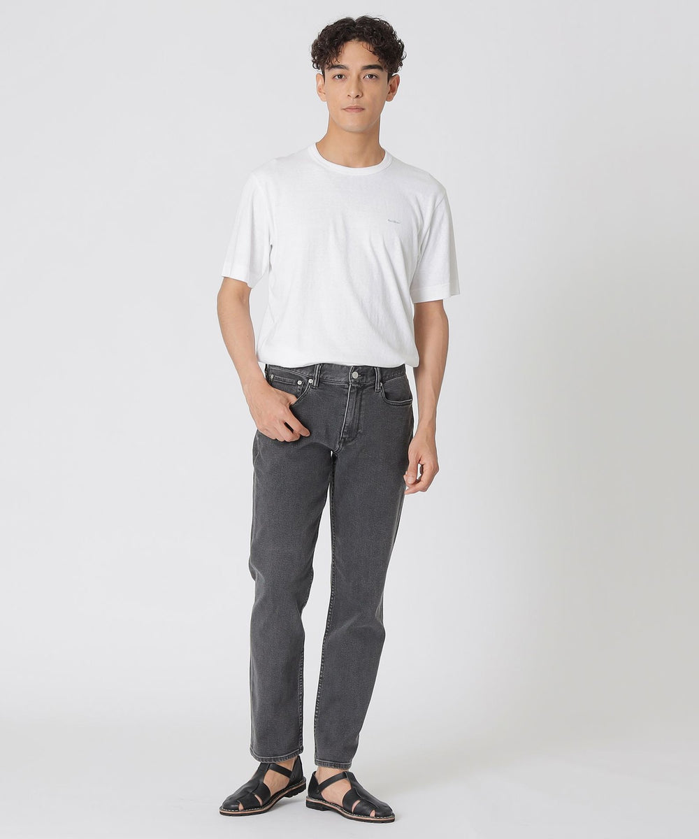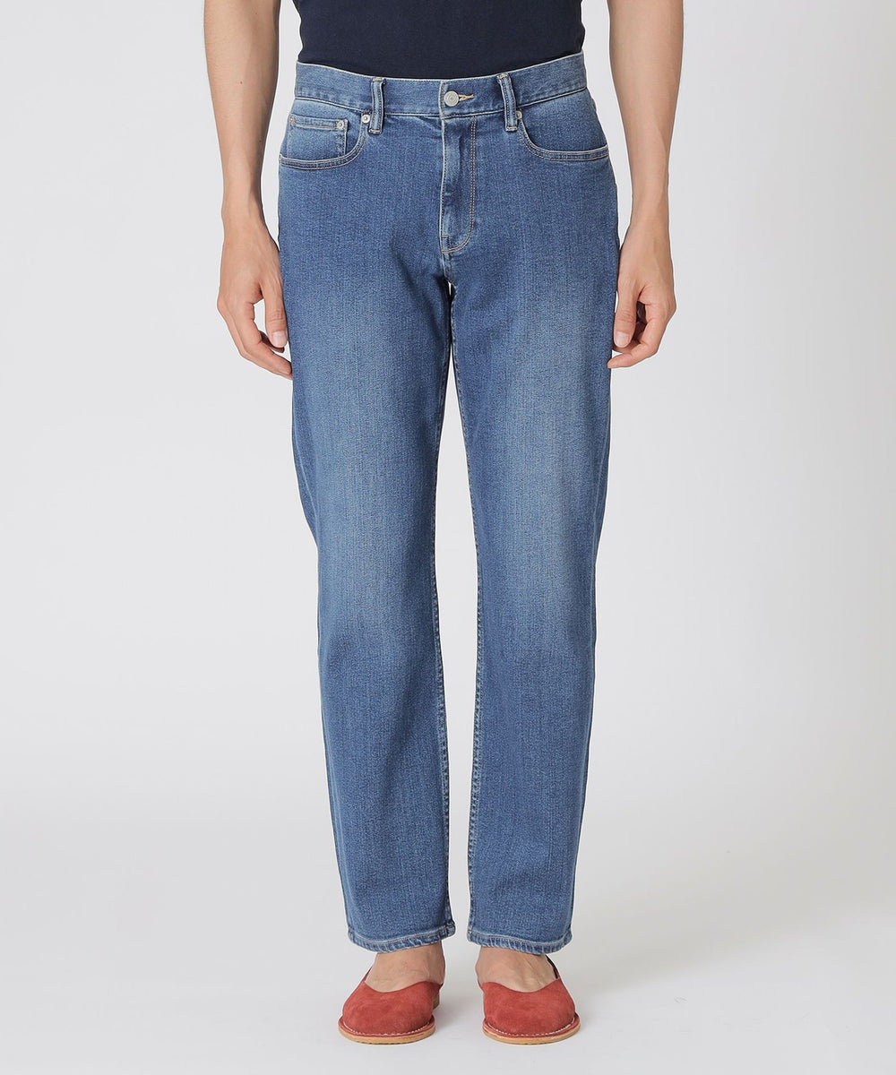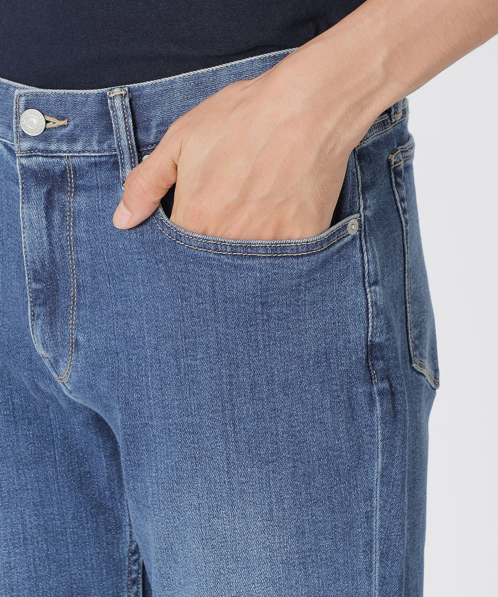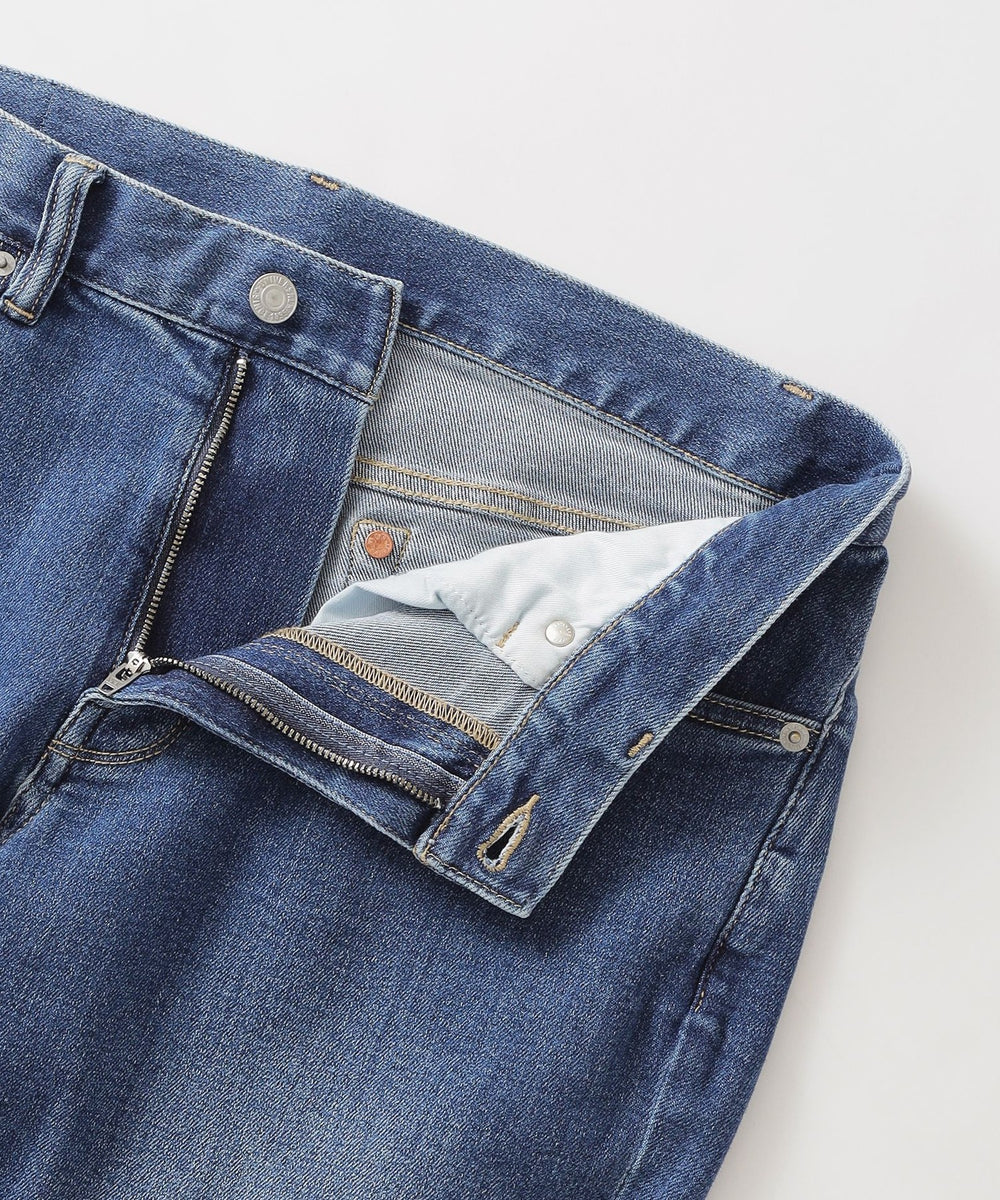 通常のデニムは肩幅程に足を開いたときにシワなく綺麗にシルエットが出るように設計しますが、このデニムはスラックスと同様に真っ直ぐ立った時に一番綺麗にシルエットが出るようにしています。