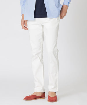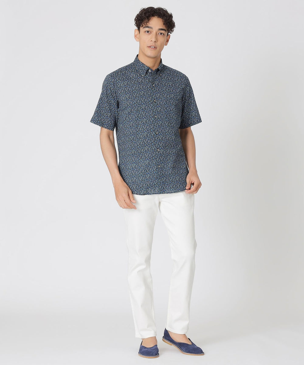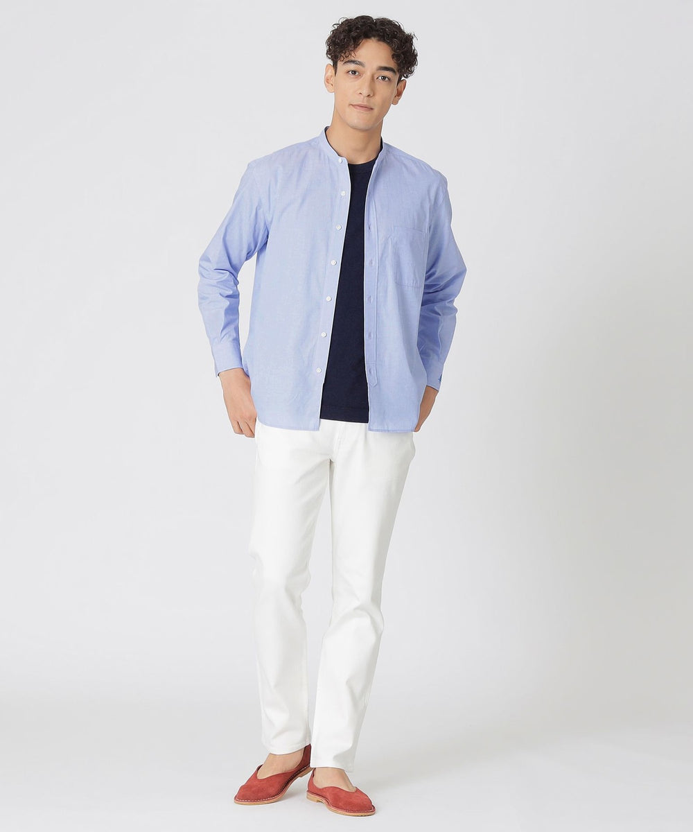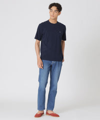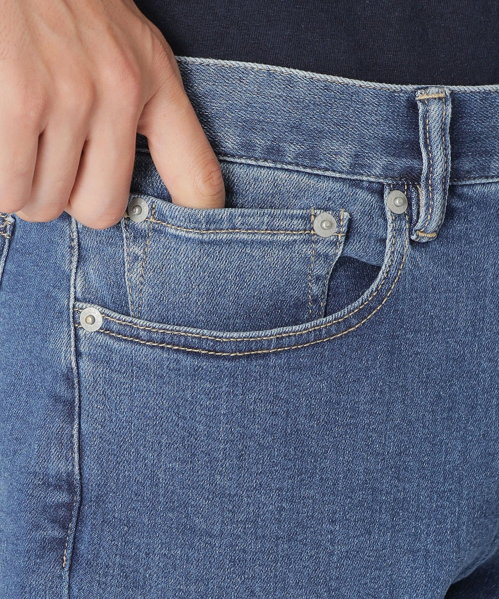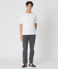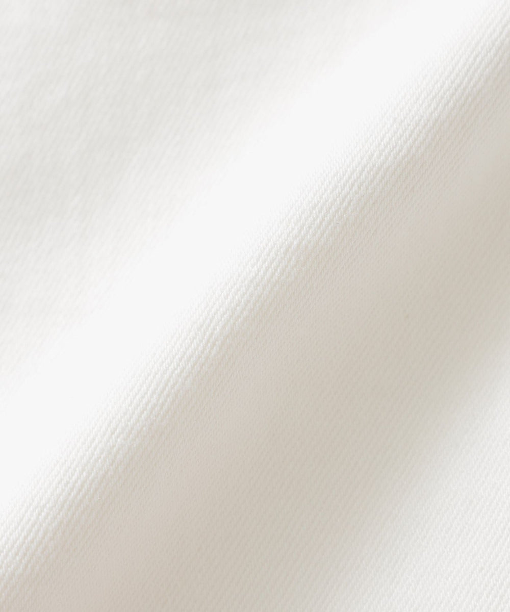 通常のデニムは肩幅程に足を開いたときにシワなく綺麗にシルエットが出るように設計しますが、このデニムはスラックスと同様に真っ直ぐ立った時に一番綺麗にシルエットが出るようにしています。