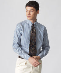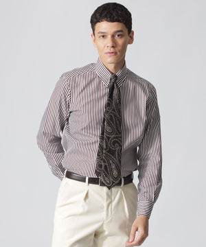 先染めでロンドンストライプを施したグログラン織の長袖ドレスシャツ。柄と織りで生みだすストライプが魅力的な大人のための一枚。
