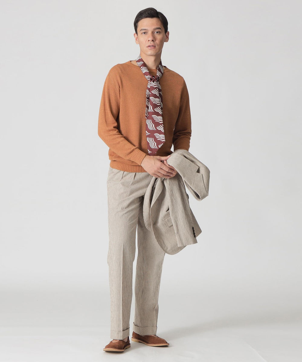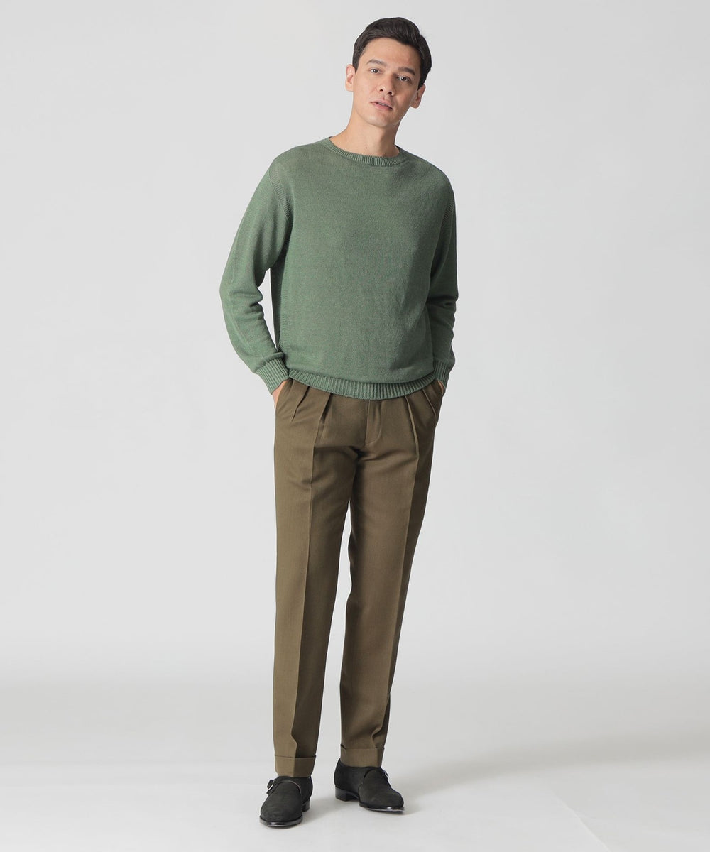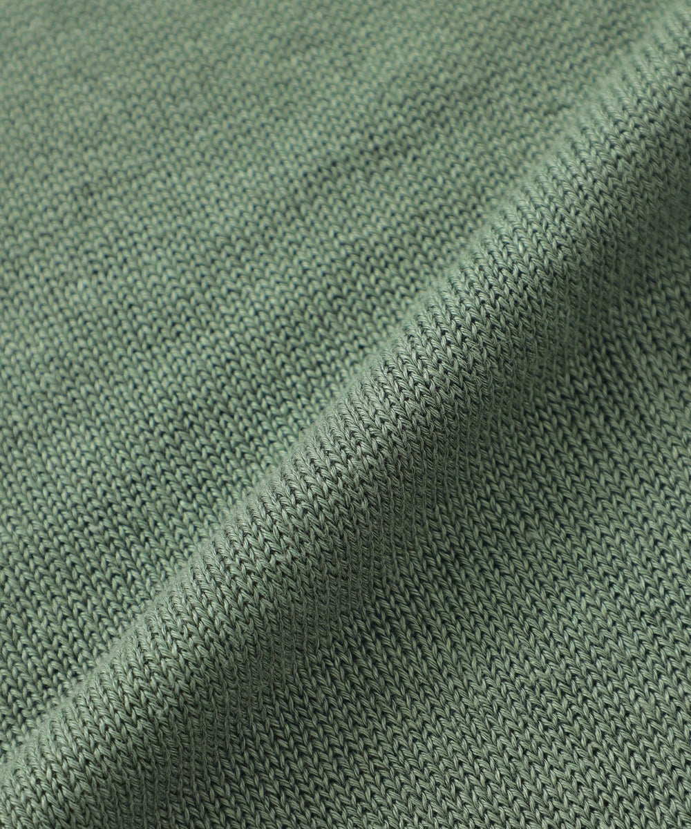 ヘンプは麻の一種でリネンより繊維は太く丈夫なことが特徴で、一般的に固いと言われる繊維ですがイタリア紡績の文化と技術で、その丈夫さを他の素材には無い良い風合いに仕上げてた糸を使用しております。