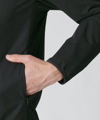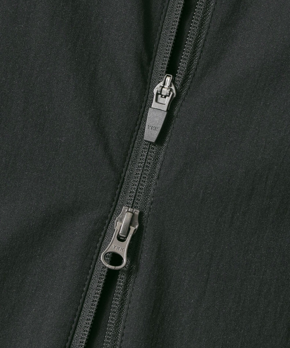 ゴルフをプレーする際を考えたパターンやパーツを採用。胸巾と背巾の前後差や裾の高低差、下からも開く逆開ファスナーはアドレスやスイングの際にもストレスを感じにくい設計。脇部分を切り替えることでコーディネイトのアクセントとなりながら、スッキリとしたシルエットを実現しました。