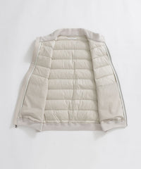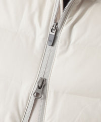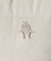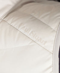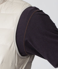 表地に東レ社のストレッチ極細繊維テキスタイル"UTS-fitR"の二重織組織を使用。ダウン横段の通常ステッチで留める部分を織組織にて留める事で軽量さとストレッチ性を出しました。更にステッチ穴が無いのでダウンの吹き出しも非常に少ないのも特徴です。晩秋から冬の防寒として活躍するダウンベスト。シンプルなデザインですが、胸に表地と同系色MOF(MAN ON THE FENCE)シリコンワッペンを、右肩の背中側にはPaul Stuartロゴを同系色プリントを施し、シックな雰囲気に仕立て上げました。