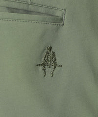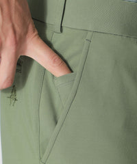 デザインはゴルフをプレイする際に工夫されたパターンやパーツ類を採用。サイドビューに緩やかな屈曲線を描かせる膝裏のダーツ、後ろを高く設定したウエストライン、ベルト裏にはシリコンオリジナルロゴプリントのエラスティックテープ、それらはアドレスやスイングの際にもストレスを感じにくい設計。