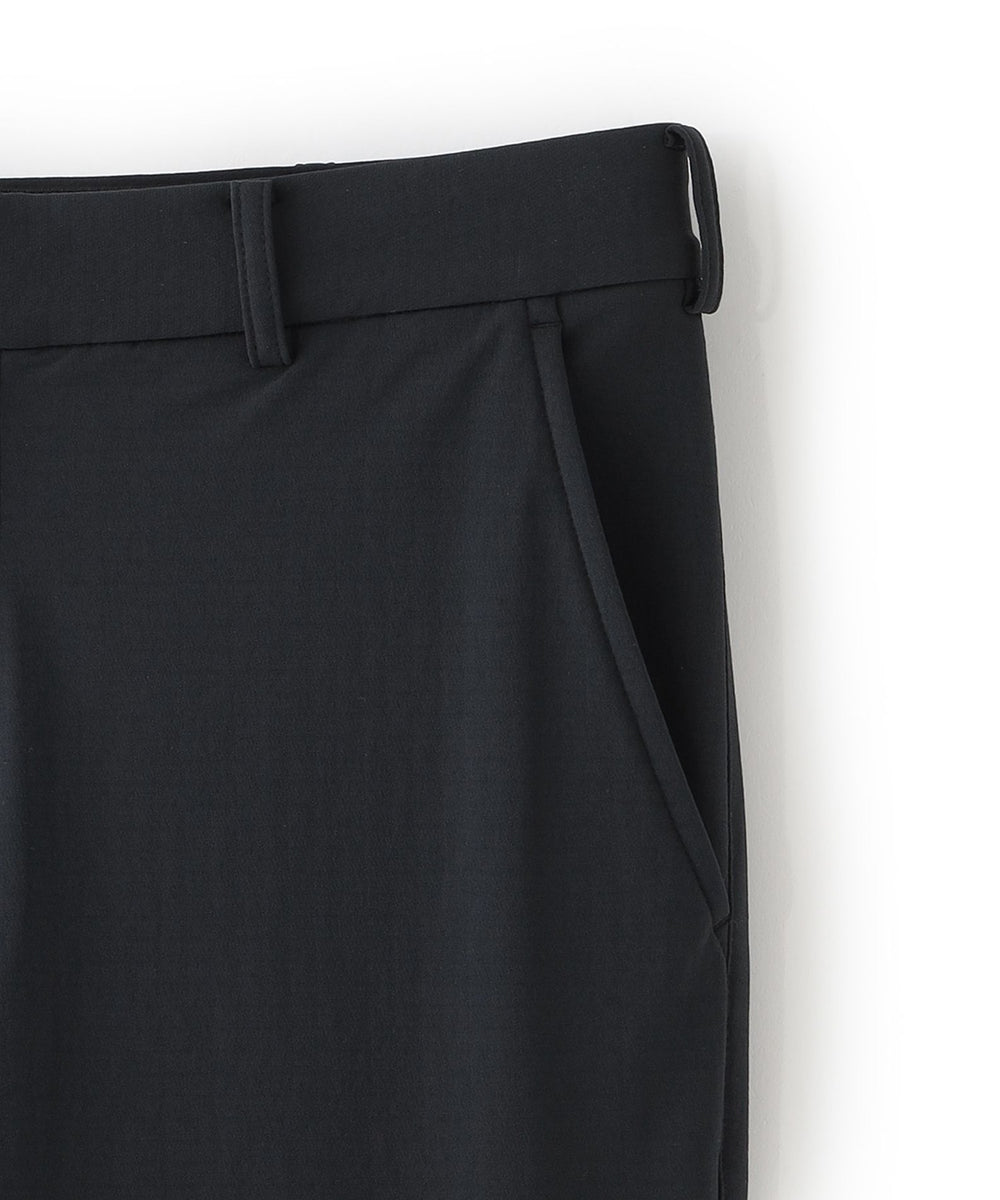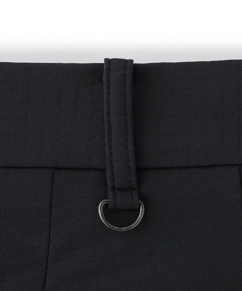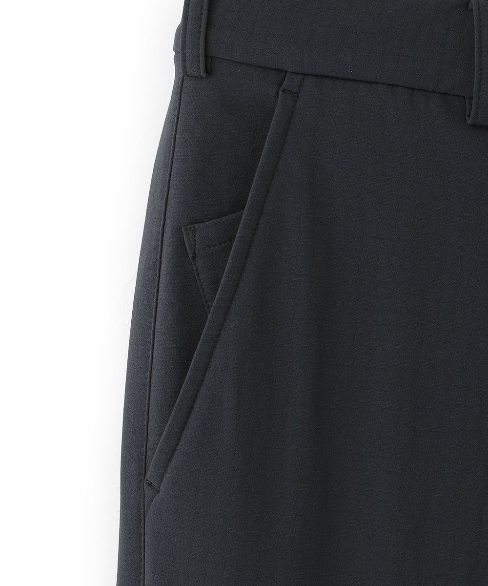 サイドビューに緩やかな屈曲線を描かせる膝裏のダーツ、後ろを高く設定したウエストライン、ベルト裏にはシリコンオリジナルロゴプリントの
