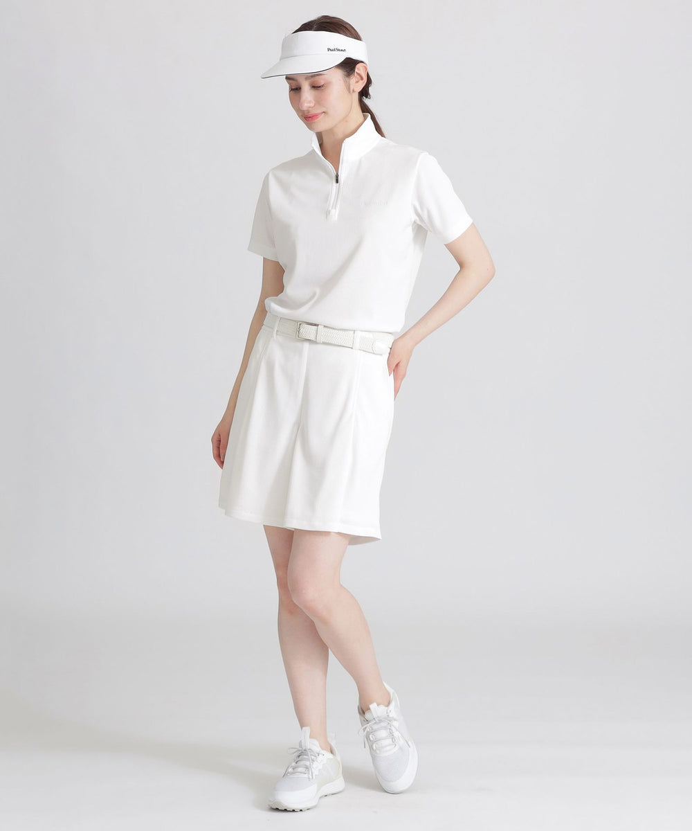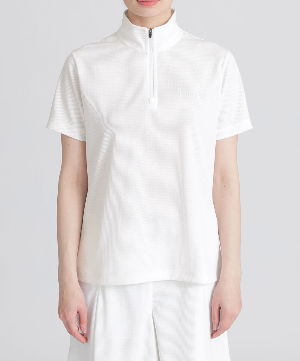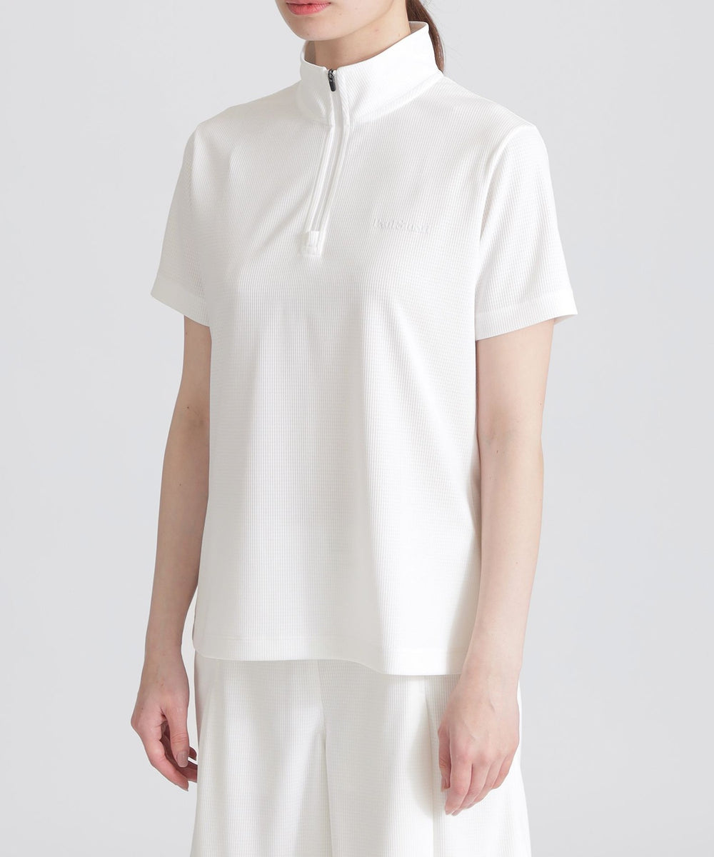 盛夏向けのメッシュ カットソーです。デザインはゴルフをプレイする際に工夫されたパターンやパーツ類を採用。程よい衿の高さ、胸巾と背巾に前後差を付けつつ、やや前傾姿勢にしているパターンニングはアドレスやスイング、捻転の動きにもスムーズに対応しやすい設計。