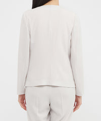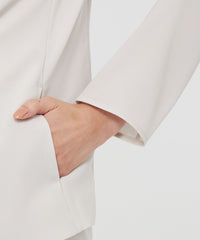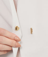 フロントの打ち合わせ部分や裾部分のカッティングにこだわり、単品ジャケットとしても着回ししやすいデザインにしました。