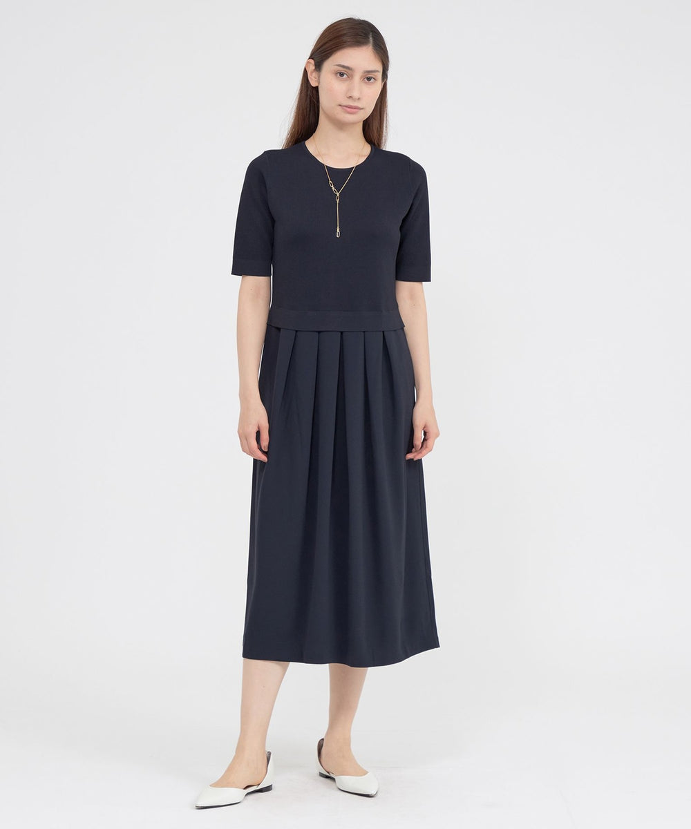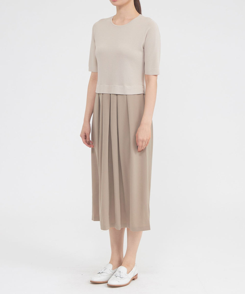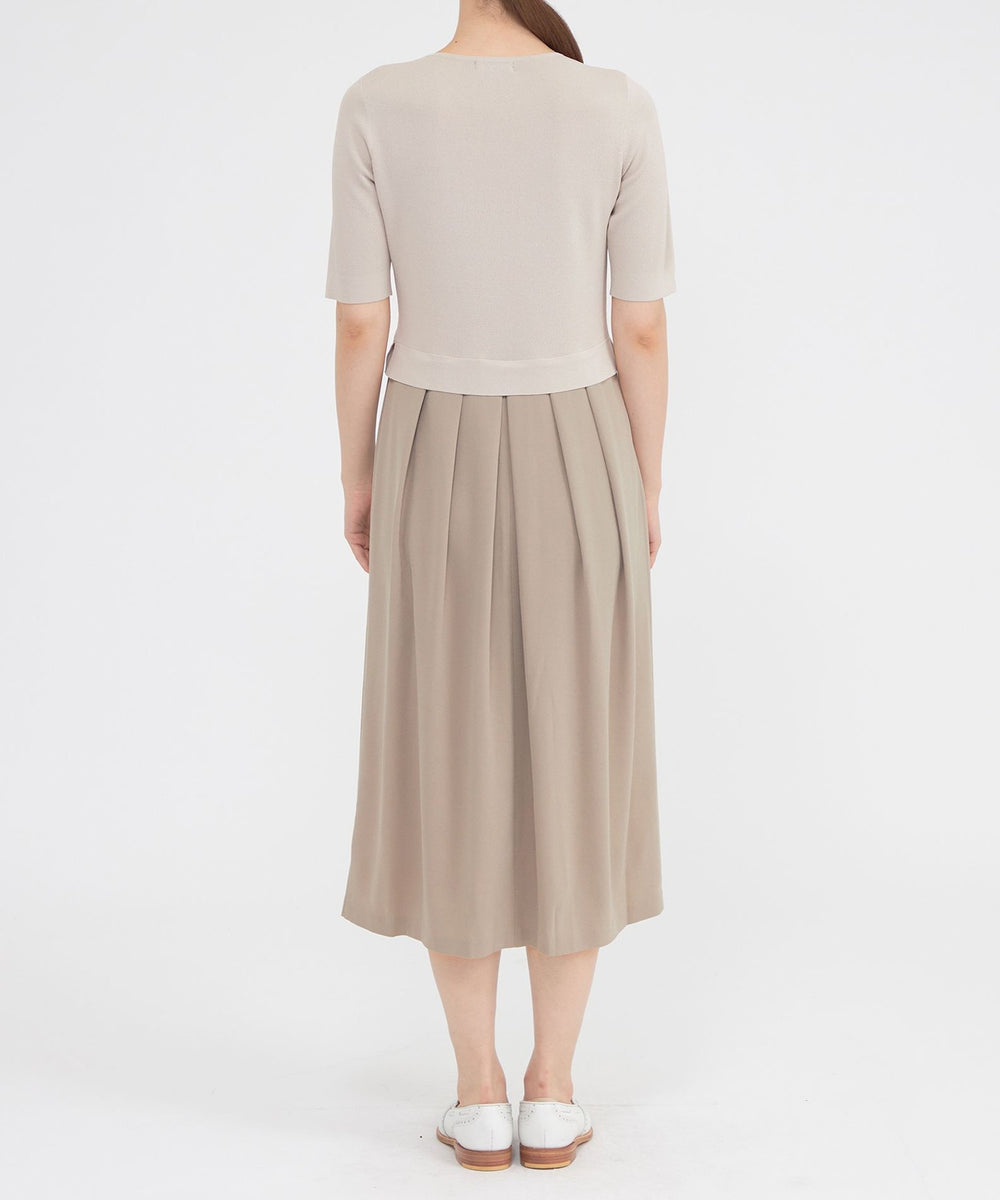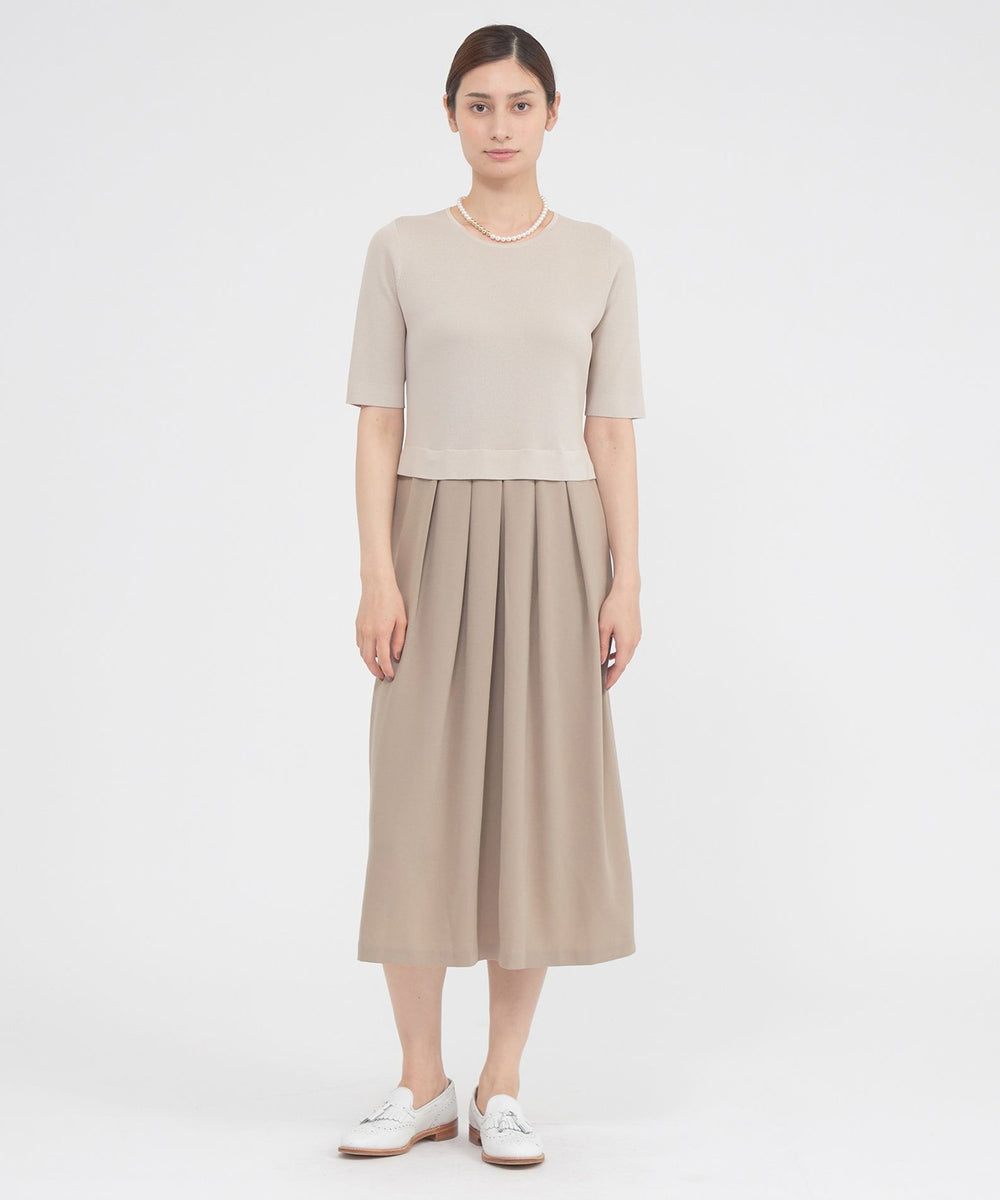 ニットと布帛のタックスカートをドッキングしたワンピースです。